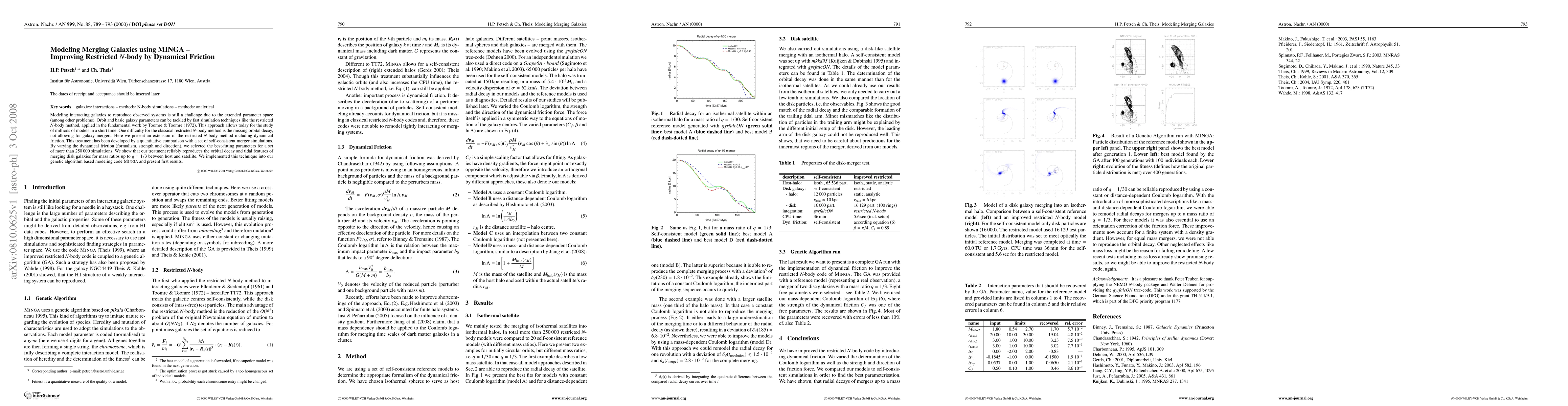 Modeling interacting galaxies to reproduce observed systems is still a challenge due to the extended parameter space (among other problems). Orbit and basic galaxy parameters can be tackled by fast simulation techniques like the restricted N-body method, applied in the fundamental work by Toomre & Toomre (1972). This approach allows today for the study of millions of models in a short time. One difficulty for the classical restricted N-body method is the missing orbital decay, not allowing for galaxy mergers. Here we present an extension of the restricted N-body method including dynamical friction. This treatment has been developed by a quantitative comparison with a set of self-consistent merger simulations. By varying the dynamical friction (formalism, strength and direction), we selected the best-fitting parameters for a set of more than 250000 simulations. We show that our treatment reliably reproduces the orbital decay and tidal features of merging disk galaxies for mass ratios up to q=1/3 between host and satellite. We implemented this technique into our genetic algorithm based modeling code MINGA and present first results.