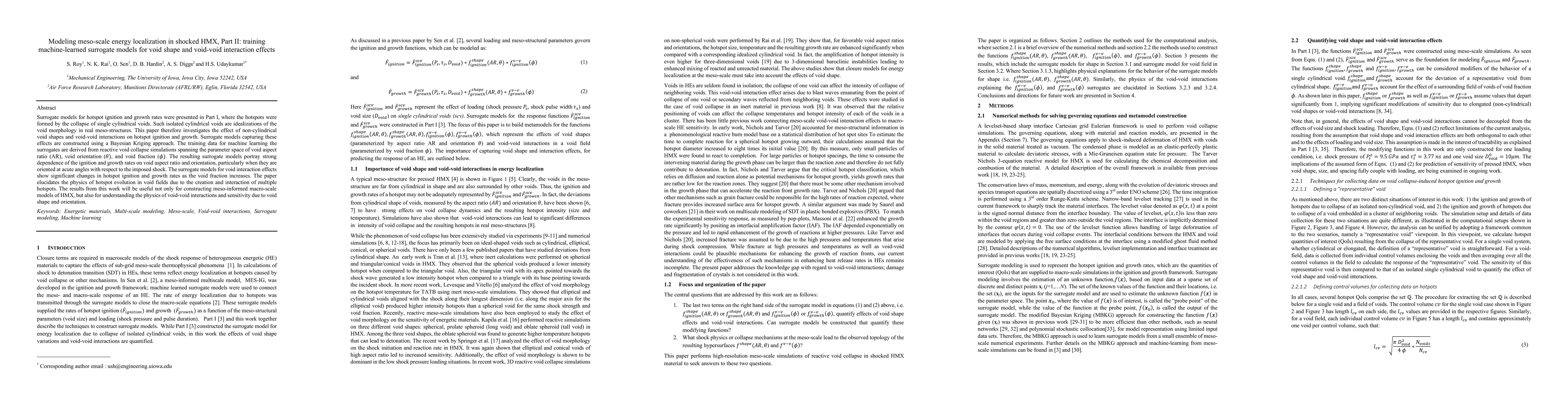 This paper develops machine-learned surrogate models using Bayesian Kriging to study the impact of non-cylindrical void shapes and void-void interactions on hotspot ignition and growth in shocked HMX, extending the models from Part I. The results highlight significant dependencies on void aspect ratio, orientation, and fraction, providing insights into the physics of void interactions and their influence on meso-scale energy localization.