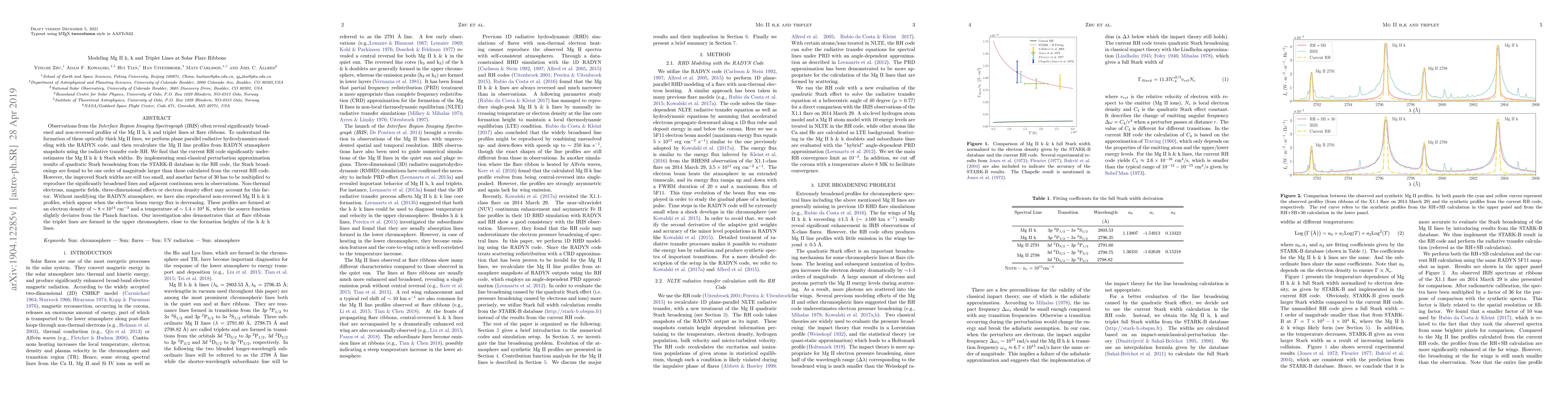 This study uses radiative hydrodynamics modeling to investigate the formation of broadened Mg II h, k, and triplet lines observed at solar flare ribbons. The research finds that current radiative transfer models underestimate the Stark broadening, requiring an additional factor of 30 to match observations, potentially due to non-thermal electrons, magnetic fields, or three-dimensional effects.