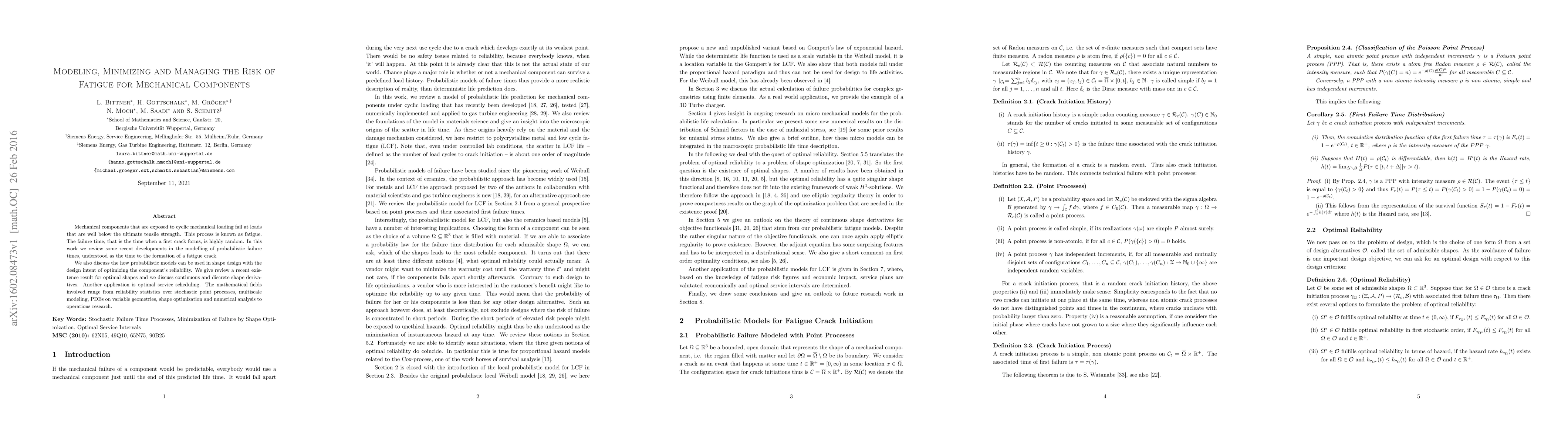 Mechanical components that are exposed to cyclic mechanical loading fail at loads that are well below the ultimate tensile strength. This process is known as fatigue. The failure time, that is the time when a first crack forms, is highly random. In this work we review some recent developments in the modelling of probabilistic failure times, understood as the time to the formation of a fatigue crack. We also discuss the how probabilistic models can be used in shape design with the design intent of optimizing the component's reliability. We give review a recent existence result for optimal shapes and we discuss continuous and discrete shape derivatives. Another application is optimal service scheduling. The mathematical fields involved range from reliability statistics over stochastic point processes, multiscale modeling, PDEs on variable geometries, shape optimization and numerical analysis to operations research.