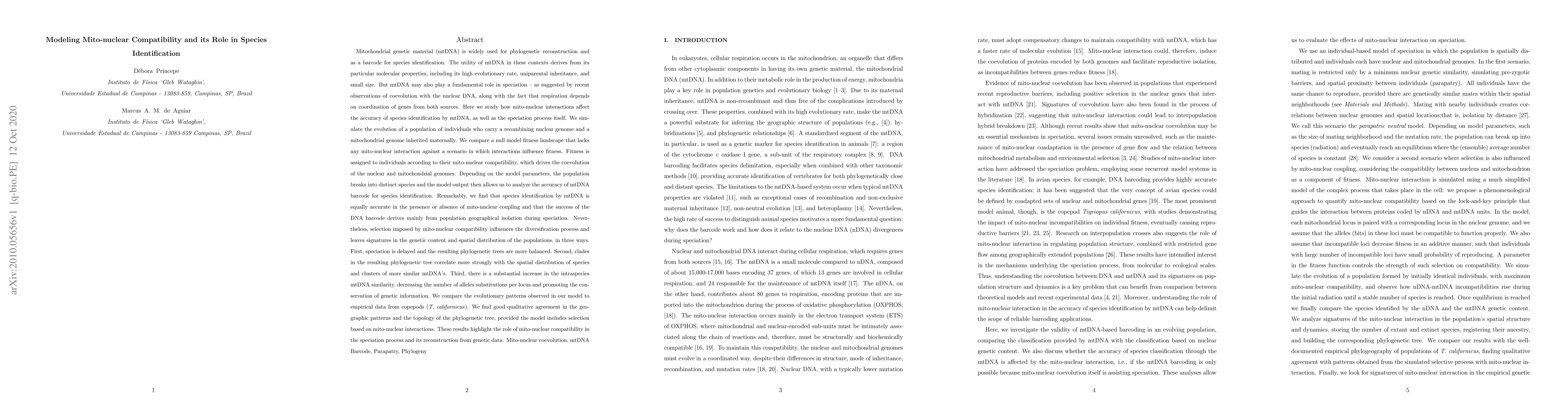 This study investigates how mito-nuclear interactions affect species identification accuracy using mtDNA and the speciation process. The research finds that mtDNA remains equally effective for species identification regardless of mito-nuclear coupling, but mito-nuclear compatibility influences diversification, resulting in more balanced phylogenetic trees, stronger clade-spatial correlations, and increased intraspecies mtDNA similarity.