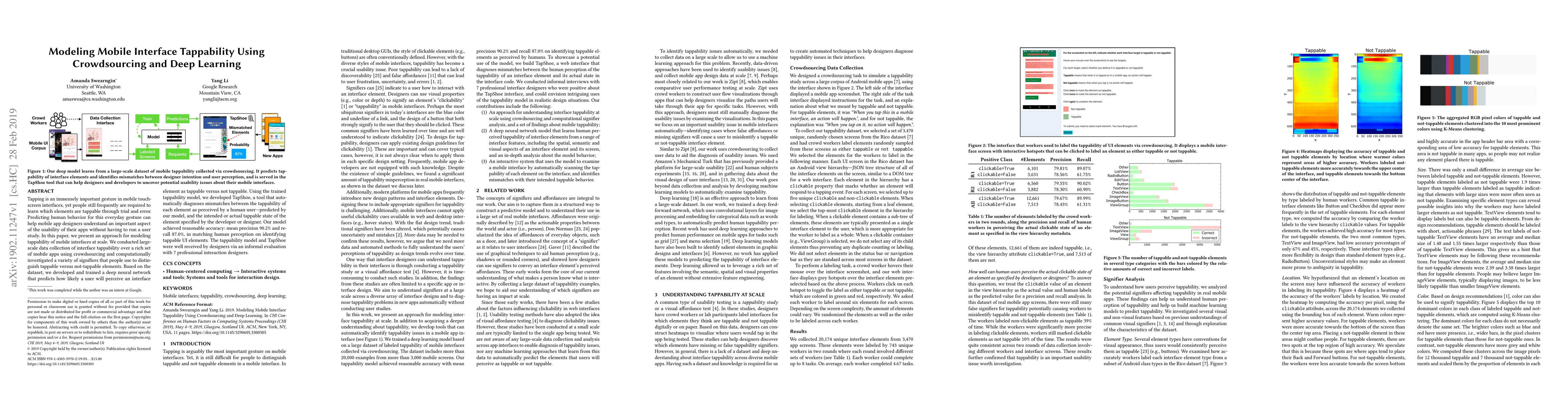 This paper presents a deep learning model to predict tappability of mobile interface elements, developed using crowdsourcing data and a neural network. The tool, TapShoe, diagnoses discrepancies between human perception and developer intent, achieving a precision of 90.2% and recall of 87.0%.
