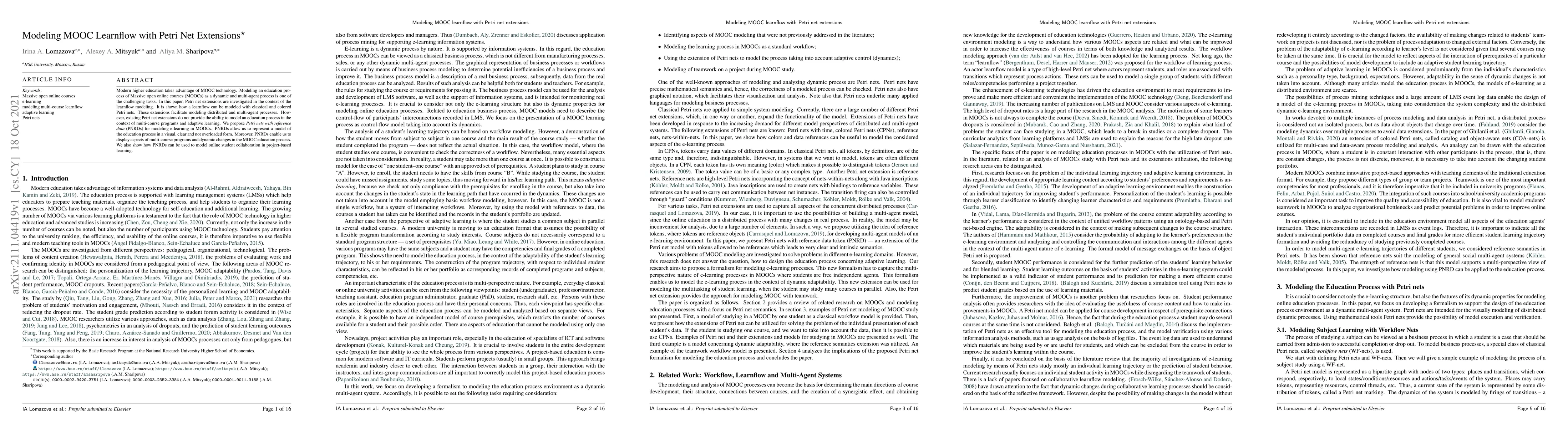 Modern higher education takes advantage of MOOC technology. Modeling an education process of Massive open online courses (MOOCs) as a dynamic and multi-agent process is one of the challenging tasks. In this paper, Petri net extensions are investigated in the context of the learnflow modeling. It is shown how a learnflow can be modeled with classical and Colored Petri nets. These extensions facilitate modeling distributed and multi-agent processes. However, existing Petri net extensions do not provide the ability to model an education process in the context of multi-course programs and adaptive learning. We propose \emph{Petri nets with reference data} (PNRDs) for modeling e-learning in MOOCs. PNRDs allow us to represent a model of the education process in a visual, clear and not overloaded form. Moreover, PNRDs enable us to display aspects of multi-course programs and dynamic changes in the MOOC education process. We also show how PNRDs can be used to model online student collaboration in project-based learning.