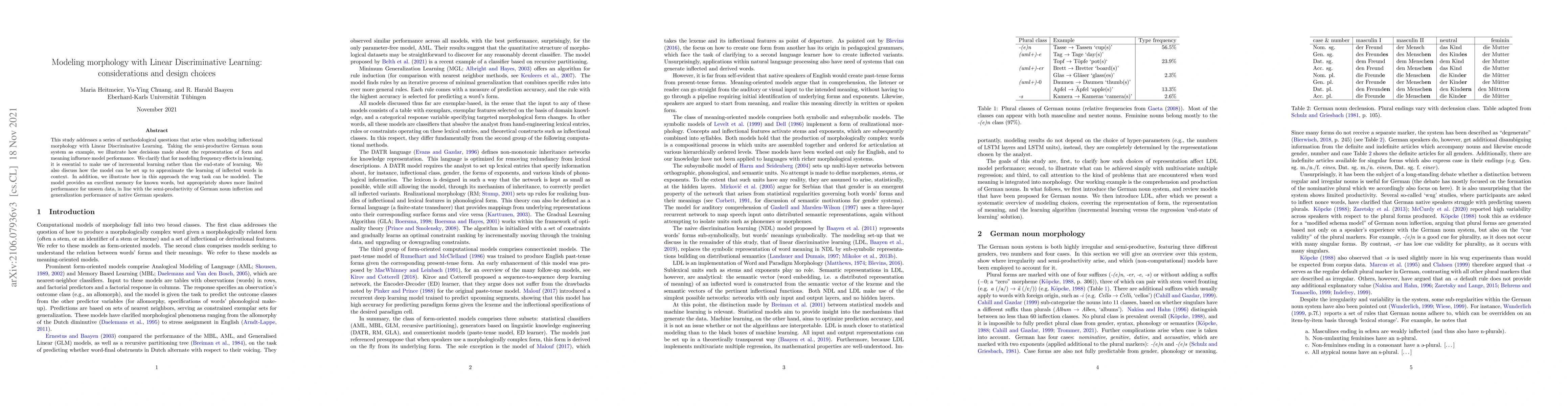 This study addresses a series of methodological questions that arise when modeling inflectional morphology with Linear Discriminative Learning. Taking the semi-productive German noun system as example, we illustrate how decisions made about the representation of form and meaning influence model performance. We clarify that for modeling frequency effects in learning, it is essential to make use of incremental learning rather than the endstate of learning. We also discuss how the model can be set up to approximate the learning of inflected words in context. In addition, we illustrate how in this approach the wug task can be modeled in considerable detail. In general, the model provides an excellent memory for known words, but appropriately shows more limited performance for unseen data, in line with the semi-productivity of German noun inflection and generalization performance of native German speakers.