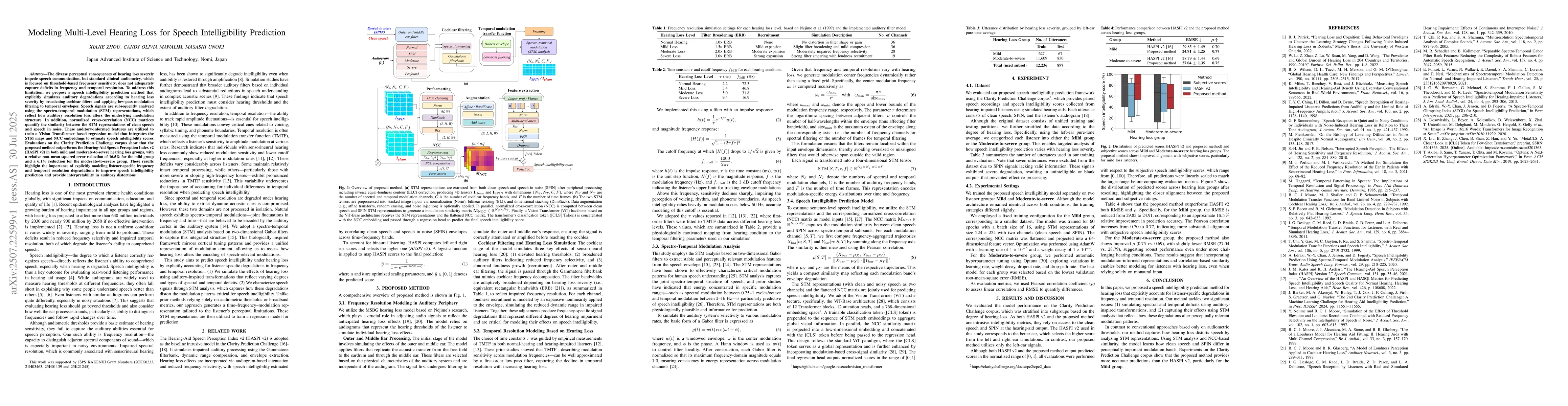 The research proposes a speech intelligibility prediction method that simulates auditory degradations according to hearing loss severity by broadening cochlear filters and applying low-pass modulation filtering to temporal envelopes. It uses spectro-temporal modulation (STM) representations and normalized cross-correlation (NCC) matrices to quantify similarity between clean speech and speech-in-noise. A Vision Transformer-based regression model integrates STM maps and NCC embeddings to estimate speech intelligibility scores.