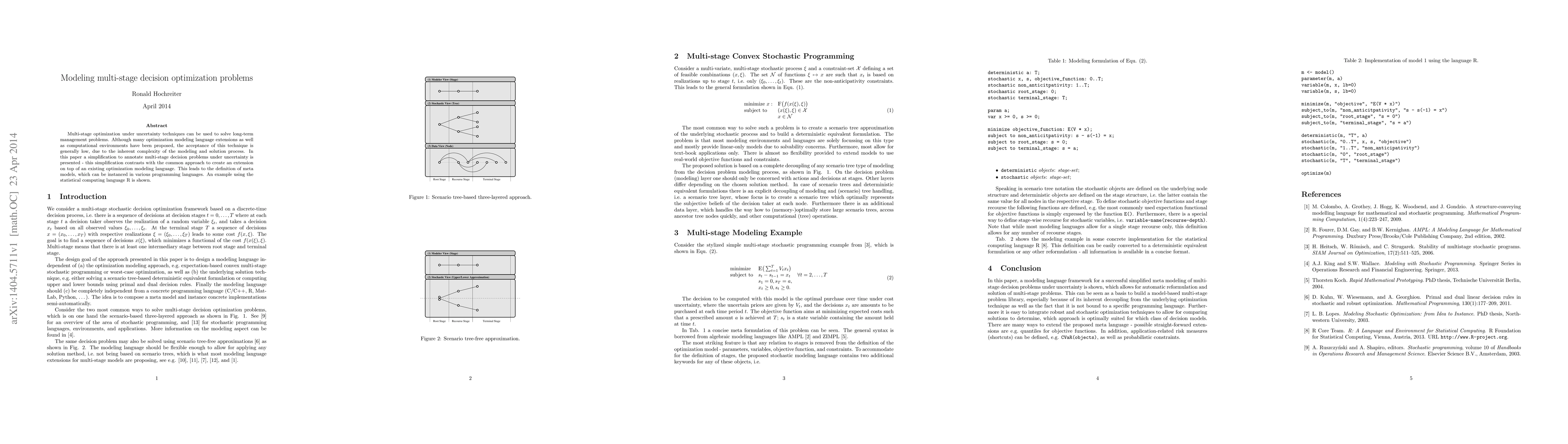 Multi-stage optimization under uncertainty techniques can be used to solve long-term management problems. Although many optimization modeling language extensions as well as computational environments have been proposed, the acceptance of this technique is generally low, due to the inherent complexity of the modeling and solution process. In this paper a simplification to annotate multi-stage decision problems under uncertainty is presented - this simplification contrasts with the common approach to create an extension on top of an existing optimization modeling language. This leads to the definition of meta models, which can be instanced in various programming languages. An example using the statistical computing language R is shown.