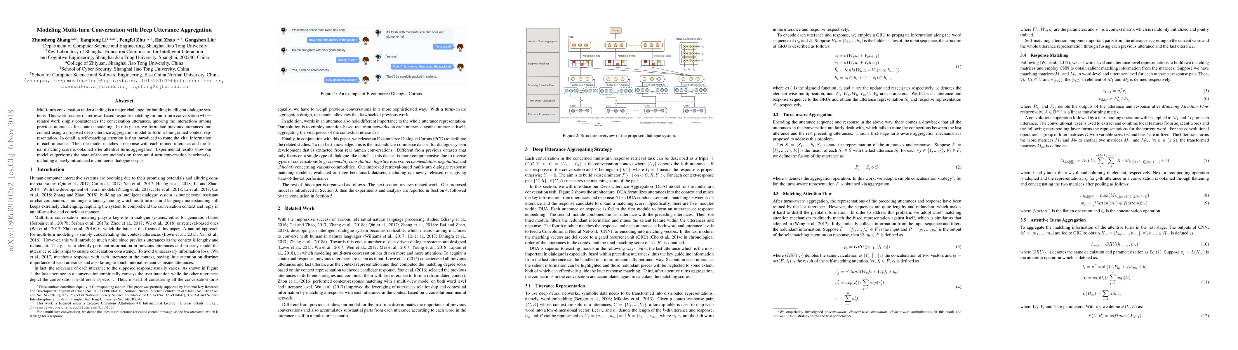 This paper proposes a deep utterance aggregation model to improve multi-turn conversation understanding by creating a fine-grained context representation using self-matching attention and attentive turns aggregation. The model outperforms existing methods on several benchmarks, including a new e-commerce dialogue corpus.