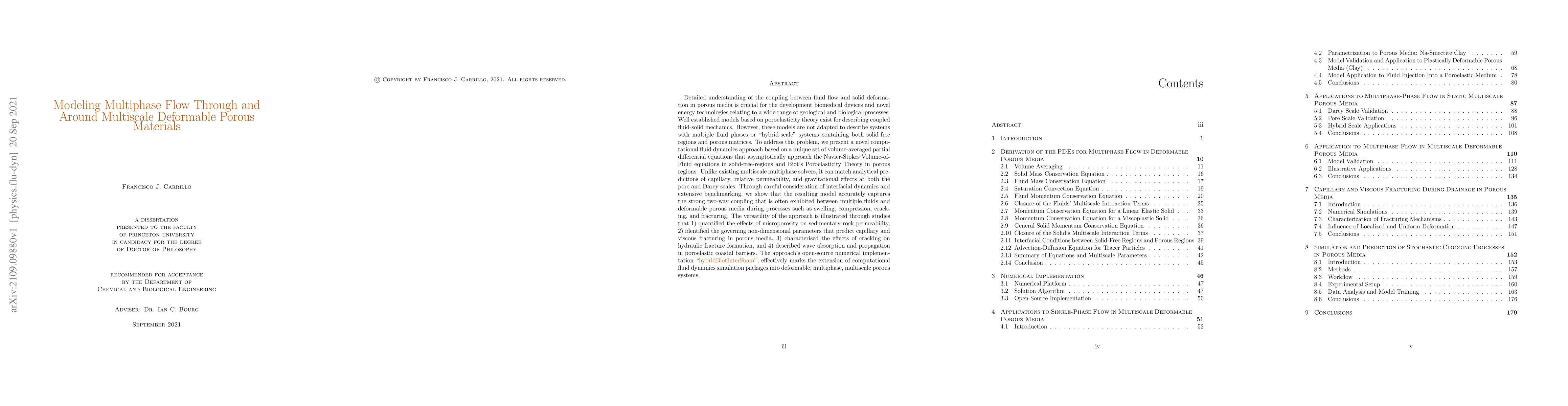 This paper introduces a novel computational model for simulating multiphase flow through and around deformable porous materials, addressing limitations of existing poroelasticity models. The new approach combines Navier-Stokes and Biot's theories, accurately capturing fluid-solid interactions at both micro and macro scales, and is demonstrated through applications in sedimentary rock permeability, fracturing, and coastal barrier wave dynamics.