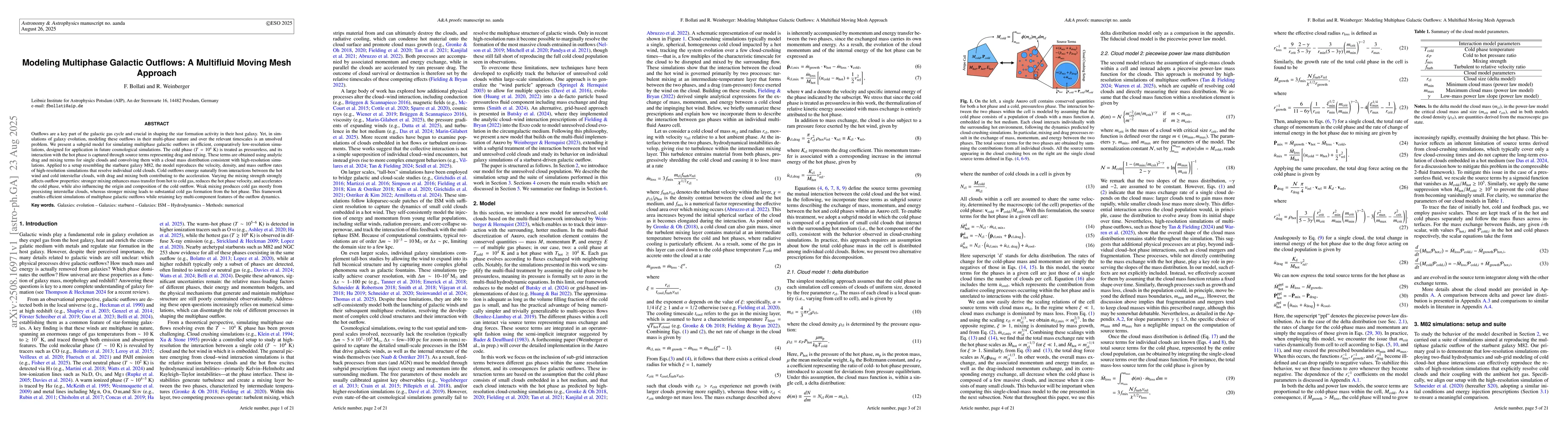 Outflows are a key part of the galactic gas cycle and crucial in shaping the star formation activity in their host galaxy. Yet, in simulations of galaxy evolution, modeling these outflows in their multi-phase nature and over the relevant timescales is an unsolved problem. We present a subgrid model for simulating multiphase galactic outflows in efficient, comparatively low-resolution simulations, designed for application in future cosmological simulations. The cold phase (T = 10000 K) is treated as pressureless, and its interaction with the hot phase is captured through source terms representing drag and mixing. These terms are obtained using analytic drag and mixing terms for single clouds and convolving them with a cloud mass distribution consistent with high-resolution simulations. Applied to a setup resembling the starburst galaxy M82, the model reproduces the velocity, density, and mass outflow rates of high-resolution simulations that resolve individual cold clouds. Cold outflows emerge naturally from interactions between the hot wind and cold interstellar clouds, with drag and mixing both contributing to the acceleration. Varying the mixing strength strongly affects outflow properties: stronger mixing enhances mass transfer from hot to cold gas, reduces the hot phase velocity, and accelerates the cold phase, while also influencing the origin and composition of the cold outflow. Weak mixing produces cold gas mostly from preexisting interstellar clouds, whereas stronger mixing leads to substantial cold gas formation from the hot phase. This framework enables efficient simulations of multiphase galactic outflows while retaining key multi-component features of the outflow dynamics.
