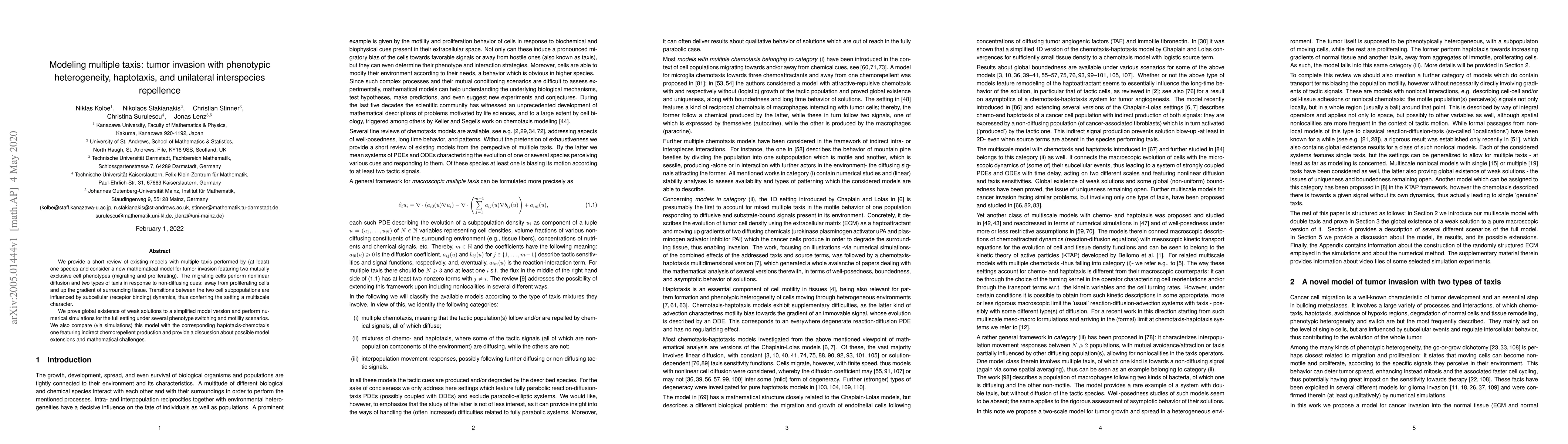 This paper reviews existing models of multi-species taxis and introduces a new mathematical model for tumor invasion involving two distinct cell phenotypes: migrating and proliferating. The model incorporates nonlinear diffusion, haptotaxis, and interspecies repellence, with transitions between phenotypes driven by receptor dynamics. The authors prove global existence of weak solutions and perform numerical simulations to compare different scenarios.
