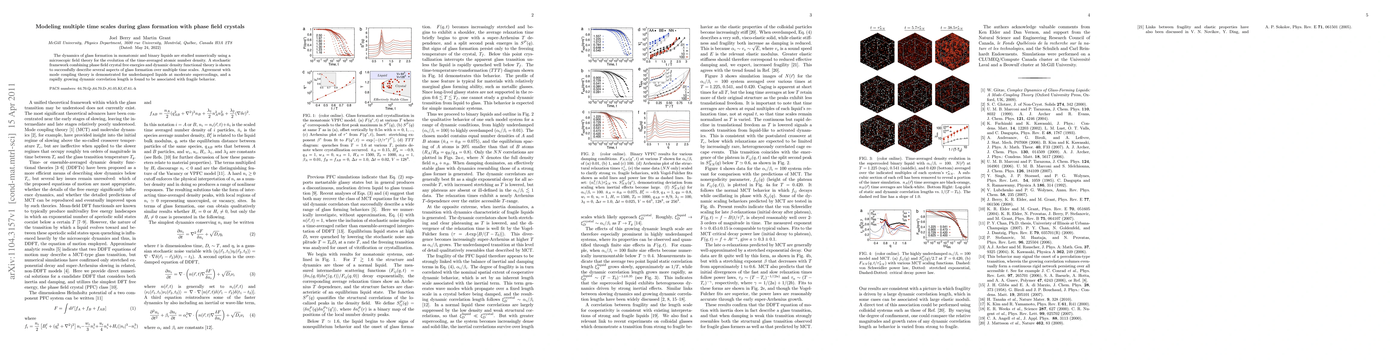 The dynamics of glass formation in monatomic and binary liquids are studied numerically using a microscopic field theory for the evolution of the time-averaged atomic number density. A stochastic framework combining phase field crystal free energies and dynamic density functional theory is shown to successfully describe several aspects of glass formation over multiple time scales. Agreement with mode coupling theory is demonstrated for underdamped liquids at moderate supercoolings, and a rapidly growing dynamic correlation length is found to be associated with fragile behavior.
