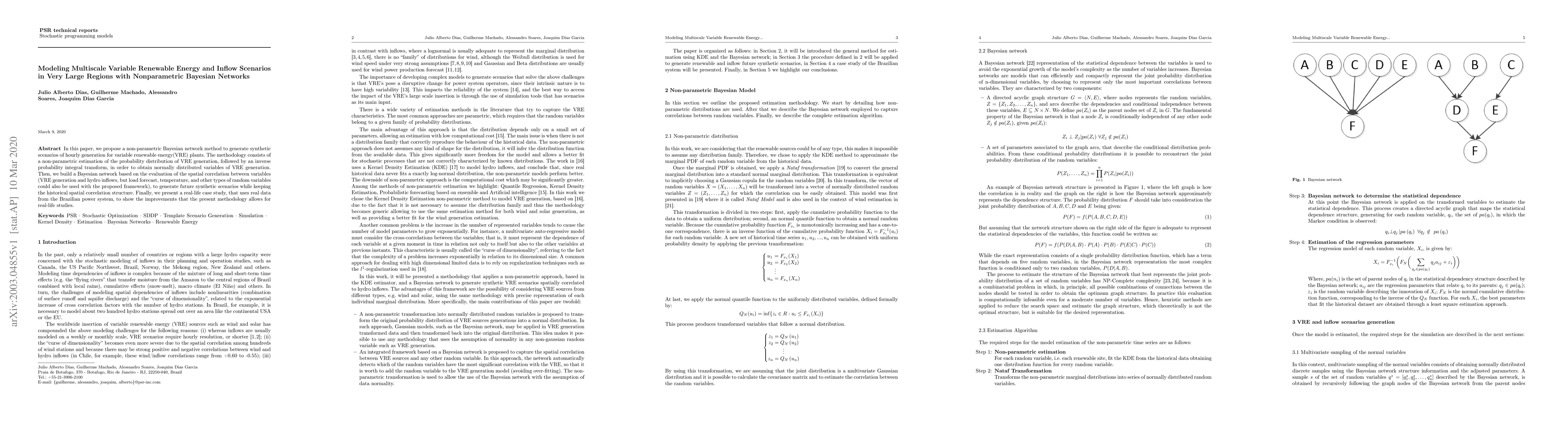 In this paper, we propose a non-parametric Bayesian network method to generate synthetic scenarios of hourly generation for variable renewable energy(VRE) plants. The methodology consists of a non-parametric estimation of the probability distribution of VRE generation, followed by an inverse probability integral transform, in order to obtain normally distributed variables of VRE generation. Then, we build a Bayesian network based on the evaluation of the spatial correlation between variables (VRE generation and hydro inflows, but load forecast, temperature, and other types of random variables could also be used with the proposed framework), to generate future synthetic scenarios while keeping the historical spatial correlation structure. Finally, we present a real-life case study, that uses real data from the Brazilian power system, to show the improvements that the present methodology allows for real-life studies.