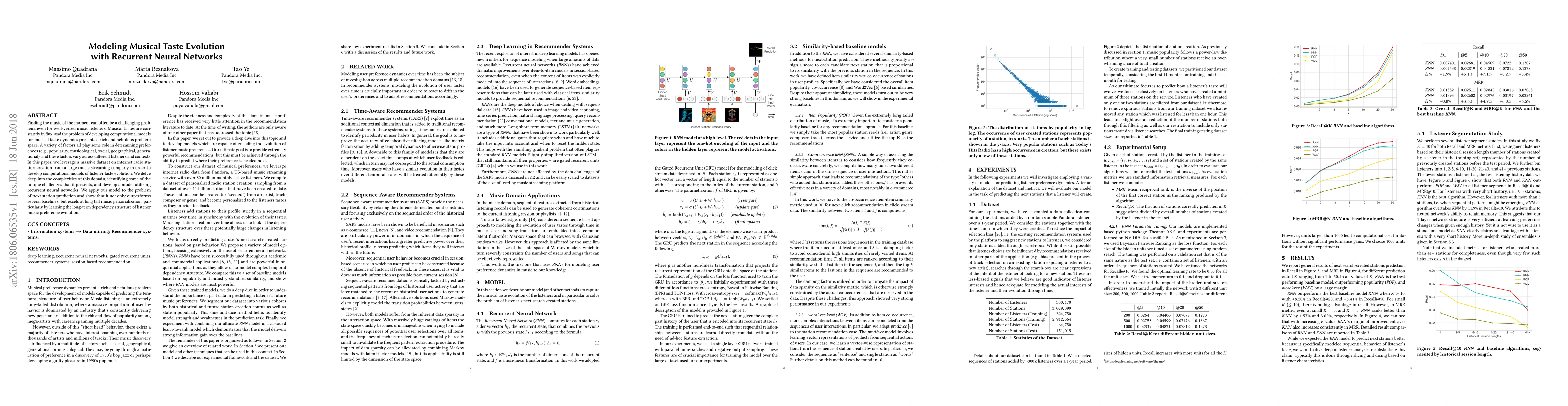 This paper develops a recurrent neural network model to predict the evolution of musical tastes using a large dataset from an internet radio service. The model outperforms baselines in next station prediction and excels at personalizing long-tail music by capturing long-term dependency structures in listener preference changes.