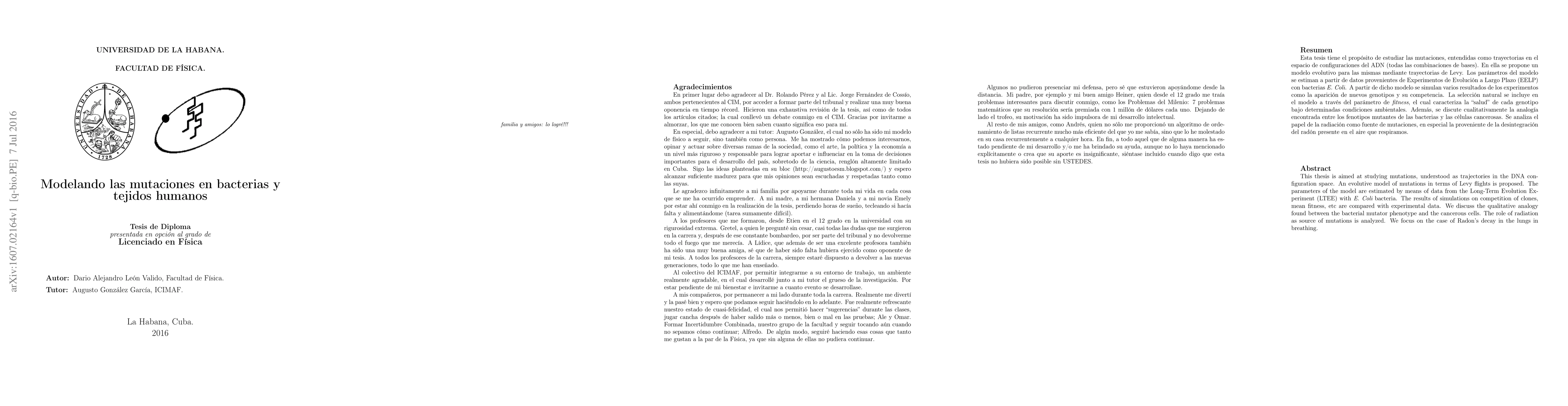 This thesis is aimed at studying mutations, understood as trajectories in the DNA configuration space. An evolutive model of mutations in terms of Levy flights is proposed. The parameters of the model are estimated by means of data from the Long-Term Evolution Experiment (LTEE) with {\it E. Coli} bacteria. The results of simulations on competition of clones, mean fitness, etc are compared with experimental data. We discuss the qualitative analogy found between the bacterial mutator phenotype and the cancerous cells. The role of radiation as source of mutations is analyzed. We focus on the case of Radon's decay in the lungs in breathing.