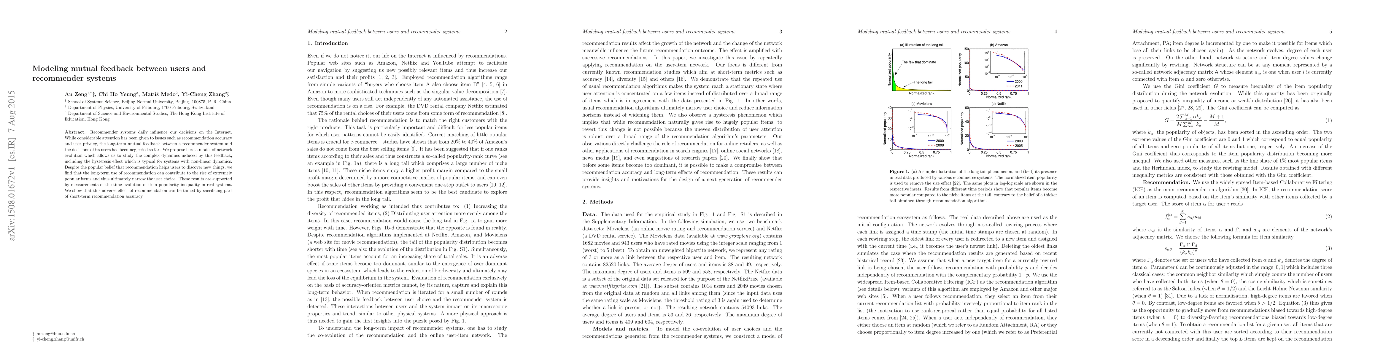 This paper models the mutual feedback between users and recommender systems, revealing that long-term use can lead to popular items dominating and narrowing user choice. The study suggests that sacrificing some short-term recommendation accuracy can mitigate this adverse effect.