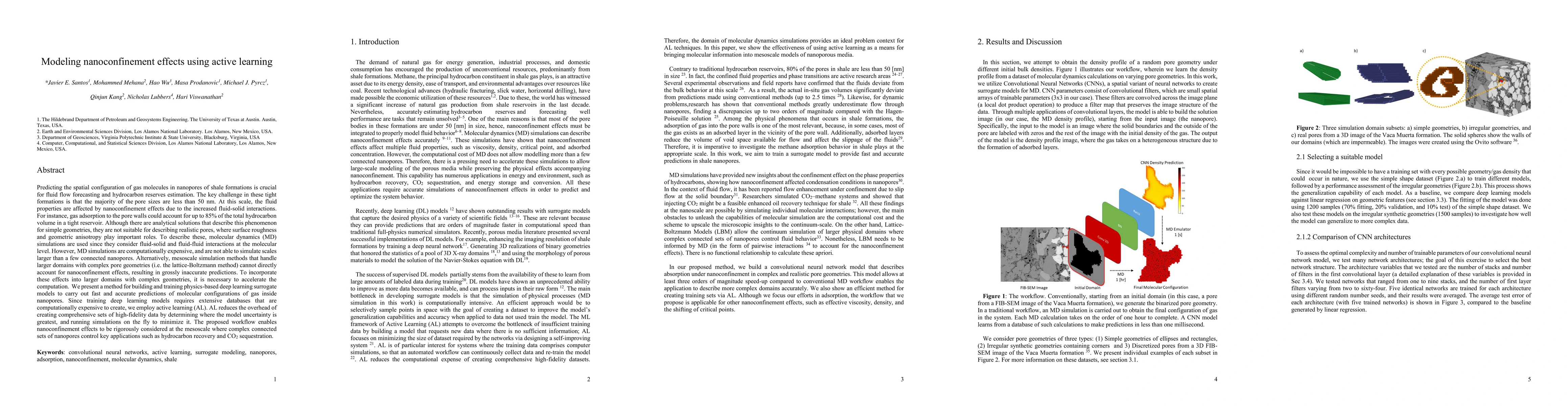 Predicting the spatial configuration of gas molecules in nanopores of shale formations is crucial for fluid flow forecasting and hydrocarbon reserves estimation. The key challenge in these tight formations is that the majority of the pore sizes are less than 50 nm. At this scale, the fluid properties are affected by nanoconfinement effects due to the increased fluid-solid interactions. For instance, gas adsorption to the pore walls could account for up to 85% of the total hydrocarbon volume in a tight reservoir. Although there are analytical solutions that describe this phenomenon for simple geometries, they are not suitable for describing realistic pores, where surface roughness and geometric anisotropy play important roles. To describe these, molecular dynamics (MD) simulations are used since they consider fluid-solid and fluid-fluid interactions at the molecular level. However, MD simulations are computationally expensive, and are not able to simulate scales larger than a few connected nanopores. We present a method for building and training physics-based deep learning surrogate models to carry out fast and accurate predictions of molecular configurations of gas inside nanopores. Since training deep learning models requires extensive databases that are computationally expensive to create, we employ active learning (AL). AL reduces the overhead of creating comprehensive sets of high-fidelity data by determining where the model uncertainty is greatest, and running simulations on the fly to minimize it. The proposed workflow enables nanoconfinement effects to be rigorously considered at the mesoscale where complex connected sets of nanopores control key applications such as hydrocarbon recovery and CO2 sequestration.