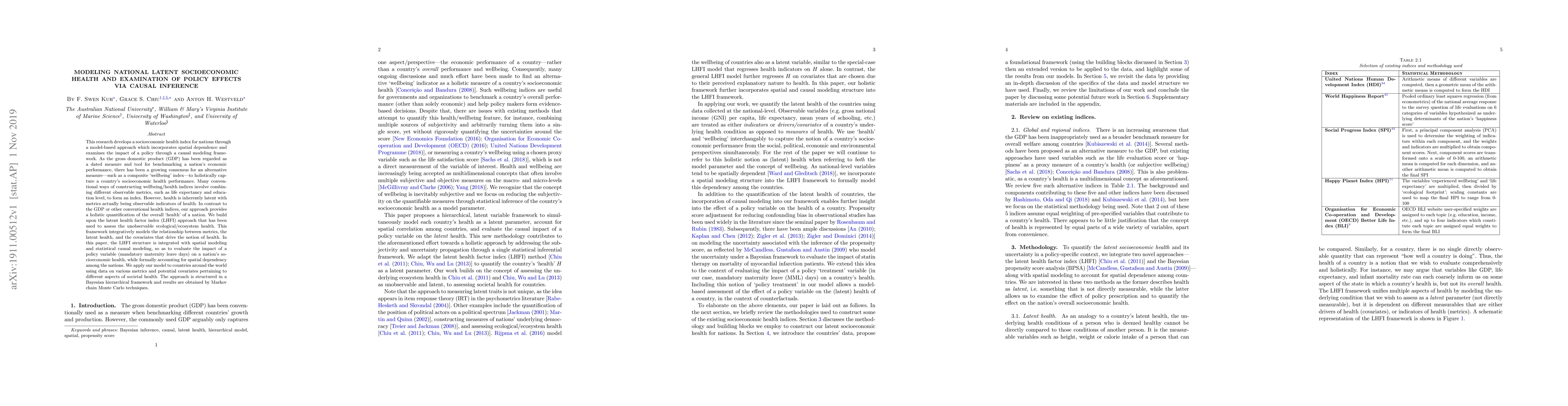 This research develops a socioeconomic health index for nations through a model-based approach which incorporates spatial dependence and examines the impact of a policy through a causal modeling framework. As the gross domestic product (GDP) has been regarded as a dated measure and tool for benchmarking a nation's economic performance, there has been a growing consensus for an alternative measure---such as a composite `wellbeing' index---to holistically capture a country's socioeconomic health performance. Many conventional ways of constructing wellbeing/health indices involve combining different observable metrics, such as life expectancy and education level, to form an index. However, health is inherently latent with metrics actually being observable indicators of health. In contrast to the GDP or other conventional health indices, our approach provides a holistic quantification of the overall `health' of a nation. We build upon the latent health factor index (LHFI) approach that has been used to assess the unobservable ecological/ecosystem health. This framework integratively models the relationship between metrics, the latent health, and the covariates that drive the notion of health. In this paper, the LHFI structure is integrated with spatial modeling and statistical causal modeling, so as to evaluate the impact of a policy variable (mandatory maternity leave days) on a nation's socioeconomic health, while formally accounting for spatial dependency among the nations. We apply our model to countries around the world using data on various metrics and potential covariates pertaining to different aspects of societal health. The approach is structured in a Bayesian hierarchical framework and results are obtained by Markov chain Monte Carlo techniques.