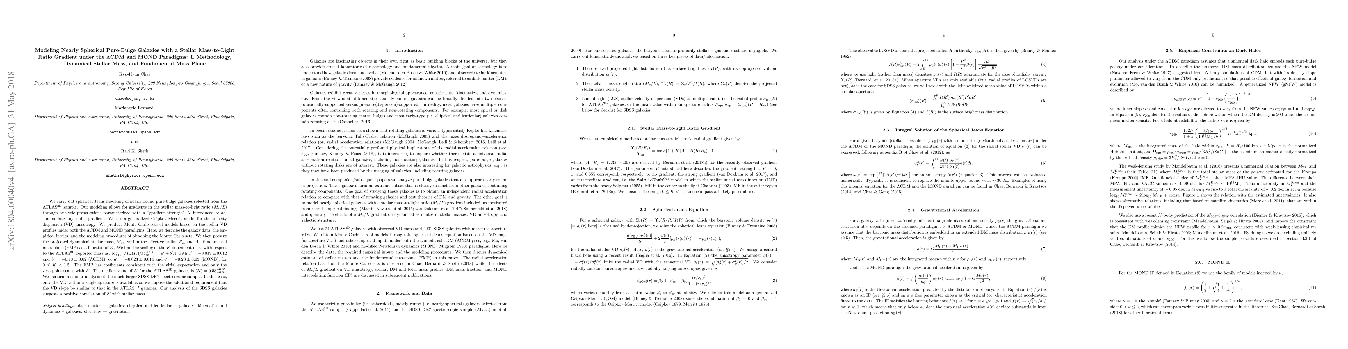 Researchers model nearly spherical pure-bulge galaxies to understand how stellar mass-to-light ratio gradients affect their mass distribution under both LambdaCDM and MOND paradigms.
