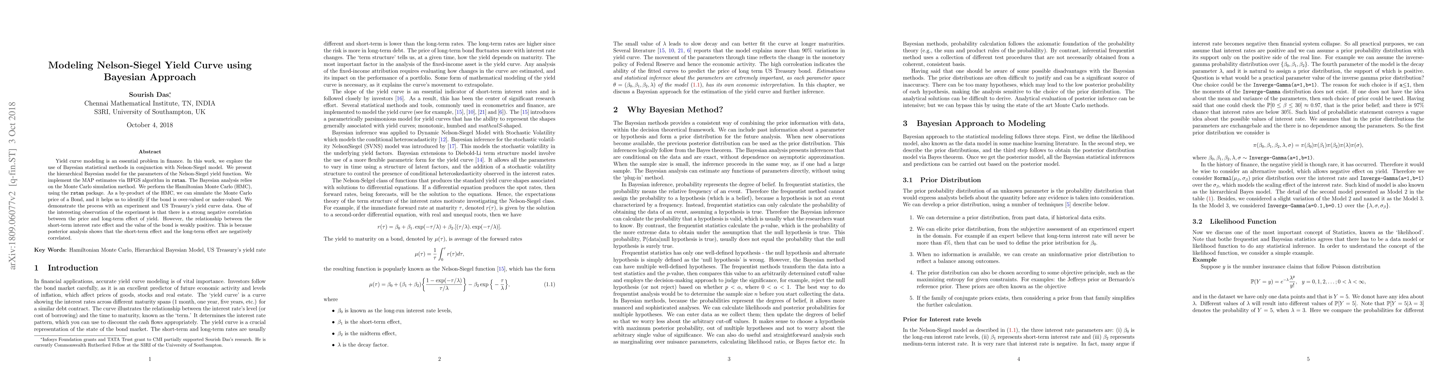 This paper models the Nelson-Siegel yield curve using a Bayesian approach, employing hierarchical Bayesian methods and Hamiltonian Monte Carlo for parameter estimation. The analysis reveals a strong negative correlation between bond price and long-term yield, while the short-term interest rate has a weakly positive effect on bond value due to their negative correlation.
