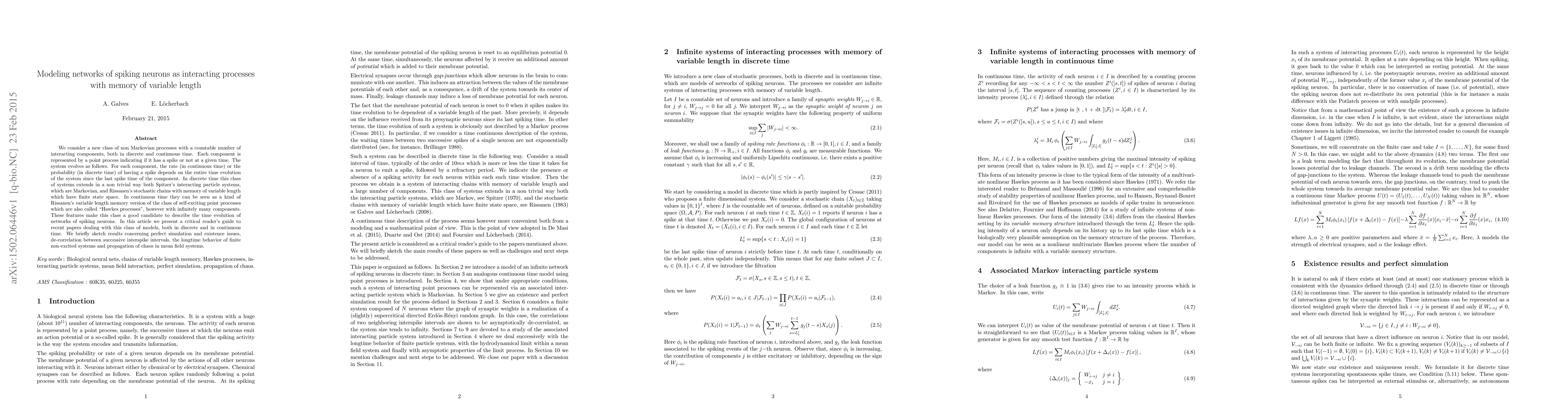 We consider a new class of non Markovian processes with a countable number of interacting components, both in discrete and continuous time. Each component is represented by a point process indicating if it has a spike or not at a given time. The system evolves as follows. For each component, the rate (in continuous time) or the probability (in discrete time) of having a spike depends on the entire time evolution of the system since the last spike time of the component. In discrete time this class of systems extends in a non trivial way both Spitzer's interacting particle systems, which are Markovian, and Rissanen's stochastic chains with memory of variable length which have finite state space. In continuous time they can be seen as a kind of Rissanen's variable length memory version of the class of self-exciting point processes which are also called "Hawkes processes", however with infinitely many components. These features make this class a good candidate to describe the time evolution of networks of spiking neurons. In this article we present a critical reader's guide to recent papers dealing with this class of models, both in discrete and in continuous time. We briefly sketch results concerning perfect simulation and existence issues, de-correlation between successive interspike intervals, the longtime behavior of finite non-excited systems and propagation of chaos in mean field systems.