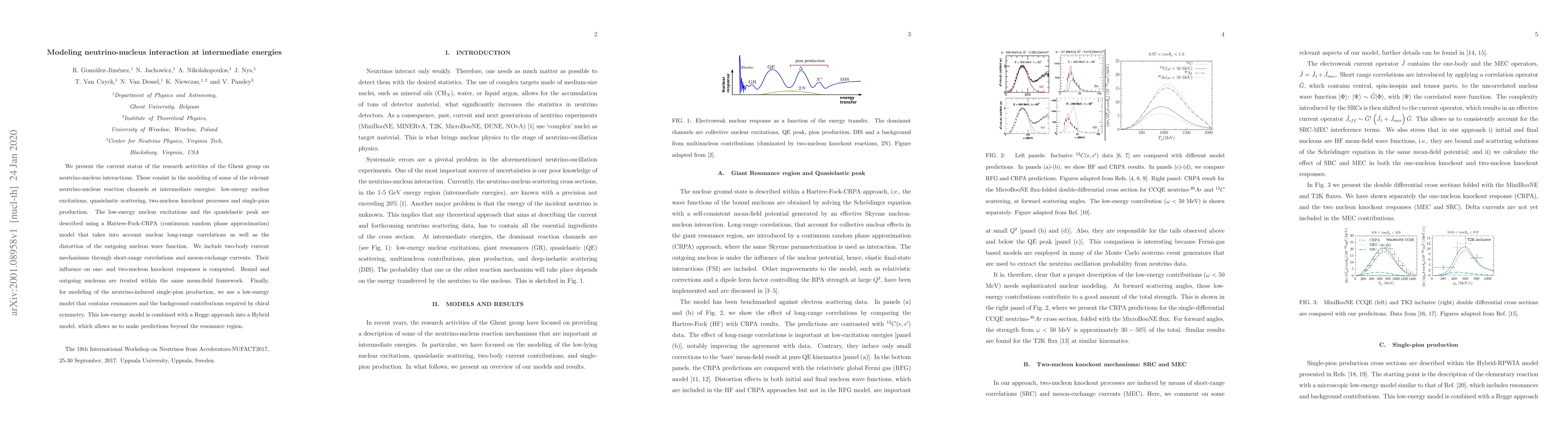 The Ghent group models neutrino-nucleus interactions at intermediate energies using a Hartree-Fock-CRPA model for low-energy nuclear excitations and quasielastic scattering, incorporating two-body current mechanisms via short-range correlations and meson-exchange currents. They also employ a low-energy model for single-pion production combined with a Regge approach into a Hybrid model.