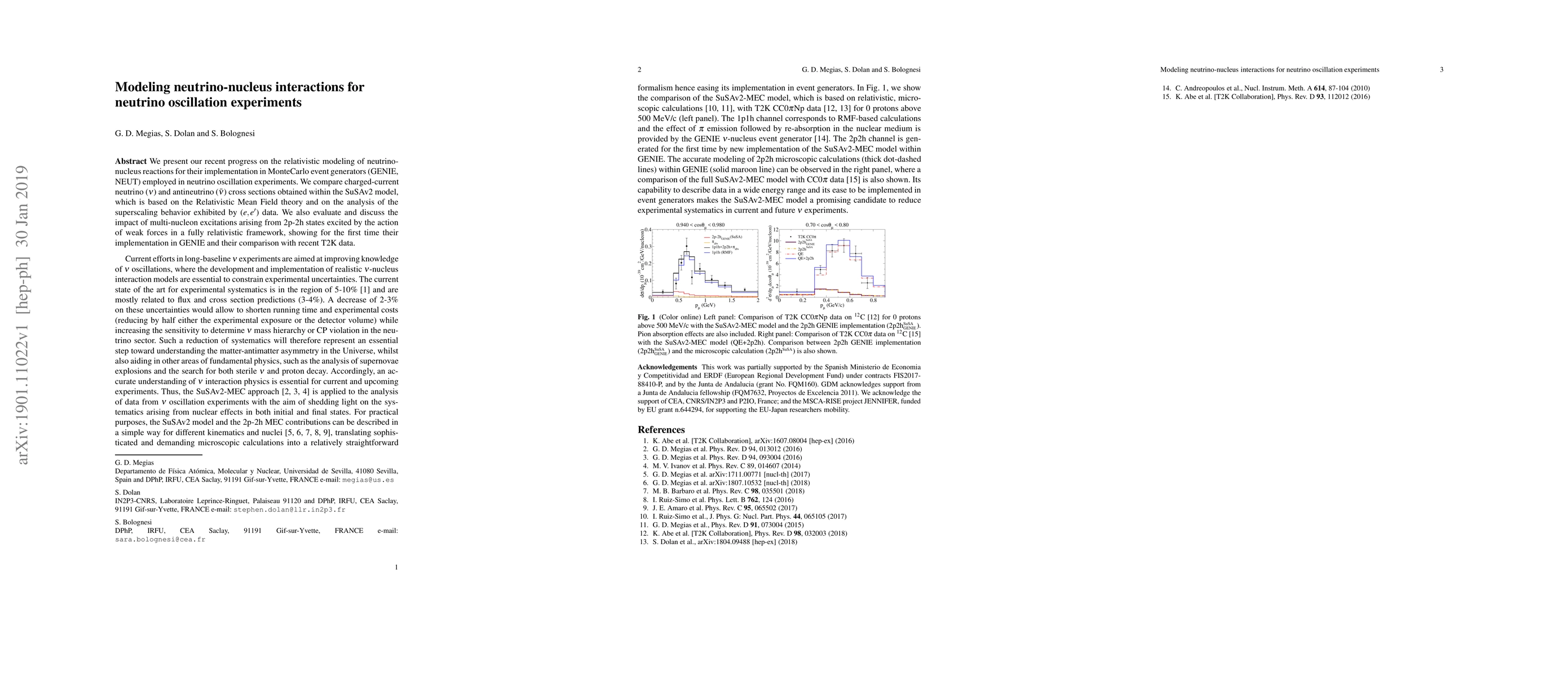This paper details advancements in modeling neutrino-nucleus interactions for neutrino oscillation experiments, focusing on the SuSAv2 model based on Relativistic Mean Field theory. The study compares charged-current cross sections for neutrinos and antineutrinos, and introduces the first implementation of multi-nucleon excitations in the GENIE Monte Carlo generator, alongside a comparison with T2K data.