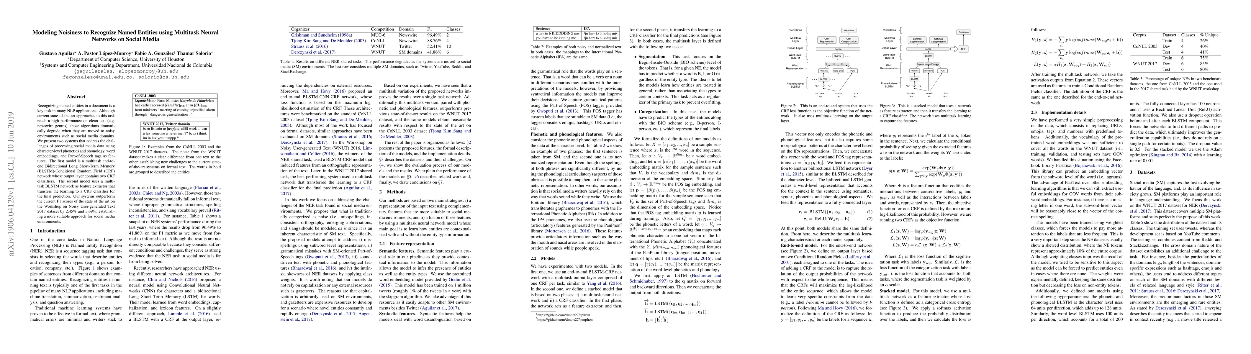 Recognizing named entities in a document is a key task in many NLP applications. Although current state-of-the-art approaches to this task reach a high performance on clean text (e.g. newswire genres), those algorithms dramatically degrade when they are moved to noisy environments such as social media domains. We present two systems that address the challenges of processing social media data using character-level phonetics and phonology, word embeddings, and Part-of-Speech tags as features. The first model is a multitask end-to-end Bidirectional Long Short-Term Memory (BLSTM)-Conditional Random Field (CRF) network whose output layer contains two CRF classifiers. The second model uses a multitask BLSTM network as feature extractor that transfers the learning to a CRF classifier for the final prediction. Our systems outperform the current F1 scores of the state of the art on the Workshop on Noisy User-generated Text 2017 dataset by 2.45% and 3.69%, establishing a more suitable approach for social media environments.