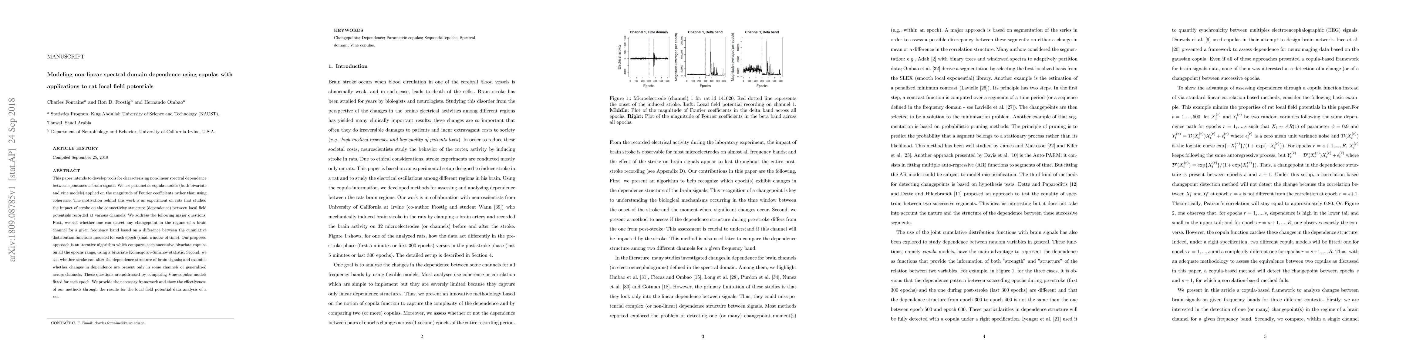 This paper intends to develop tools for characterizing non-linear spectral dependence between spontaneous brain signals. We use parametric copula models (both bivariate and vine models) applied on the magnitude of Fourier coefficients rather than using coherence. The motivation behind this work is an experiment on rats that studied the impact of stroke on the connectivity structure (dependence) between local field potentials recorded at various channels. We address the following major questions. First, we ask whether one can detect any changepoint in the regime of a brain channel for a given frequency band based on a difference between the cumulative distribution functions modeled for each epoch (small window of time). Our proposed approach is an iterative algorithm which compares each successive bivariate copulas on all the epochs range, using a bivariate Kolmogorov-Smirnov statistic. Second, we ask whether stroke can alter the dependence structure of brain signals; and examine whether changes in dependence are present only in some channels or generalized across channels. These questions are addressed by comparing Vine-copulas models fitted for each epoch. We provide the necessary framework and show the effectiveness of our methods through the results for the local field potential data analysis of a rat.