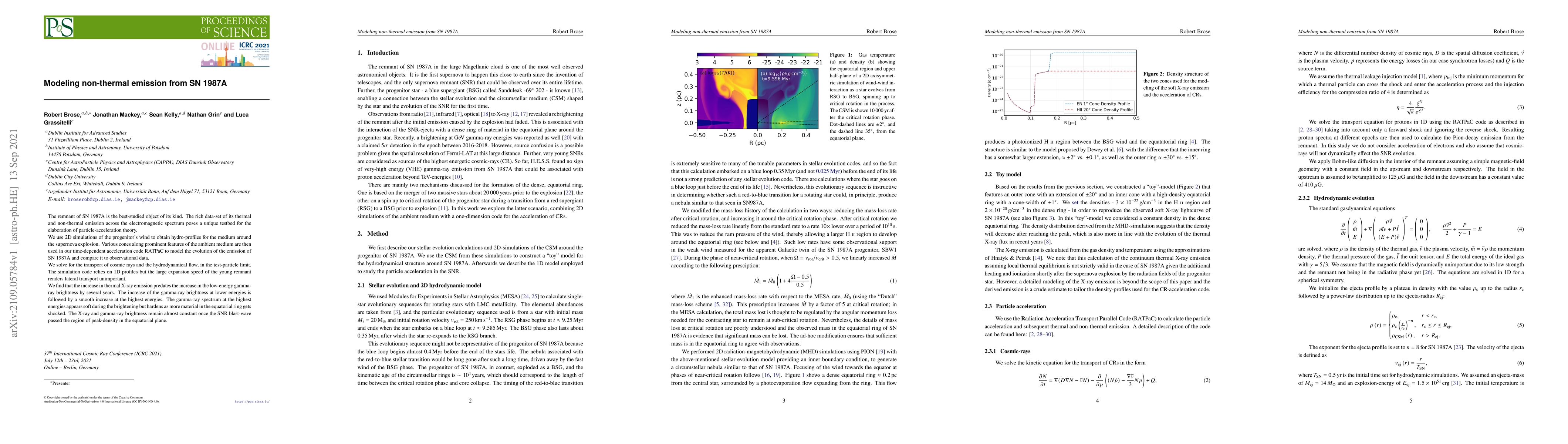 This paper models the non-thermal emission from SN 1987A using 2D simulations and RATPaC code, finding that thermal X-ray emission increases before low-energy gamma rays, while high-energy gamma rays show a softening spectrum that hardens as more material is shocked.