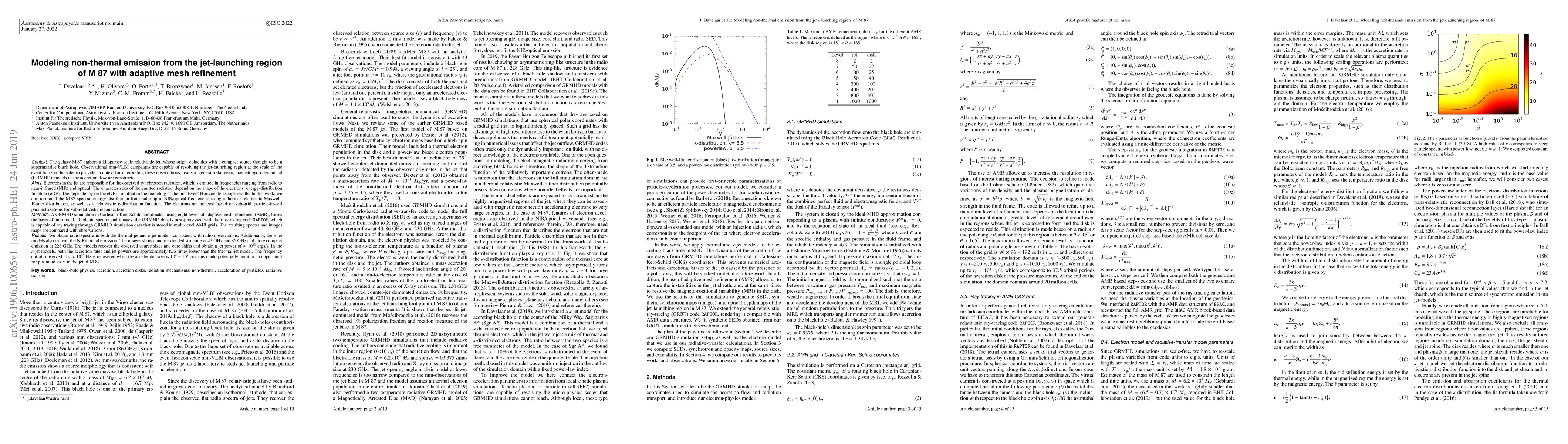 The galaxy M 87 harbors a kiloparsec-scale relativistic jet, whose origin coincides with a supermassive black hole. Observational mm-VLBI campaigns are capable of resolving the jet-launching region at the scale of the event horizon. In order to provide a context for interpreting these observations, realistic general-relativistic magnetohydrodynamical (GRMHD) models of the accretion flow are constructed. The characteristics of the observed spectral-energy distribution (SED) depend on the shape of the electrons' energy-distribution function (eDF). The dependency on the eDF is omitted in the modeling of the first Event Horizon Telescope results. In this work, we aim to model the M 87 SED from radio up to NIR/optical frequencies using a thermal-relativistic Maxwell- J\"uttner distribution, as well as a relativistic $\kappa$-distribution function. The electrons are injected based on sub-grid, particle-in-cell parametrizations for sub-relativistic reconnection. A GRMHD simulation in Cartesian-Kerr-Schild coordinates, using eight levels of adaptive mesh refinement (AMR), forms the basis of our model. To obtain spectra and images, the GRMHD data is post-processed with the ray-tracing code RAPTOR, which is capable of ray tracing through AMR GRMHD simulation data. We obtain radio spectra in both the thermal-jet and $\kappa$-jet models consistent with radio observations. Additionally, the $\kappa$-jet models also recover the NIR/optical emission. The models recover the observed source sizes and core shifts and obtain a jet power of $\approx 10^{43}$ ergs/s. In the $\kappa$-jet models, both the accretion rates and jet powers are approximately two times lower than the thermal-jet model. The frequency cut-off observed at $\nu \approx 10^{15}$ Hz is recovered when the accelerator size is $10^6$ - $10^8$ cm, this could potentially point to an upper limit for plasmoid sizes in the jet of M 87.