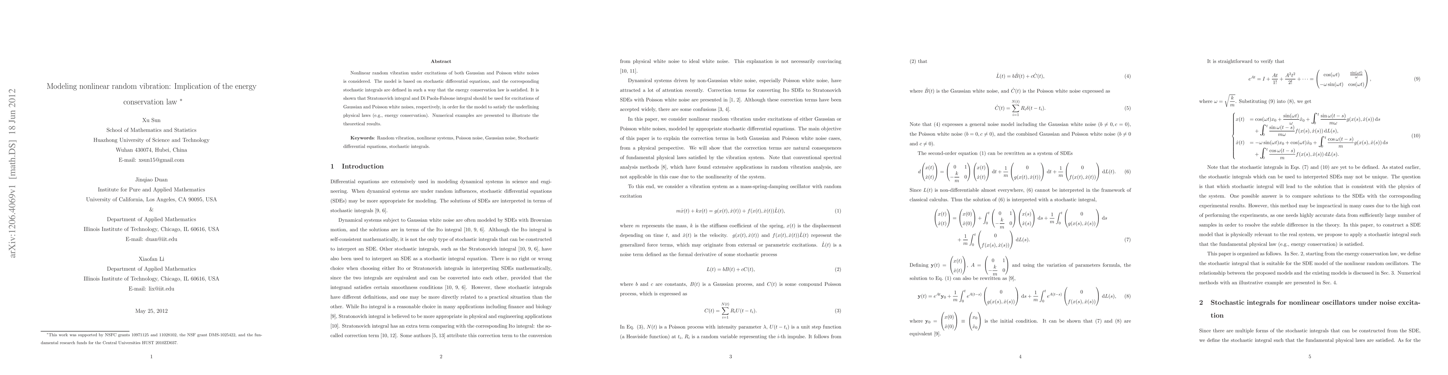 Nonlinear random vibration under excitations of both Gaussian and Poisson white noises is considered. The model is based on stochastic differential equations, and the corresponding stochastic integrals are defined in such a way that the energy conservation law is satisfied. It is shown that Stratonovich integral and Di Paola-Falsone integral should be used for excitations of Gaussian and Poisson white noises, respectively, in order for the model to satisfy the underlining physical laws (e.g., energy conservation). Numerical examples are presented to illustrate the theoretical results.