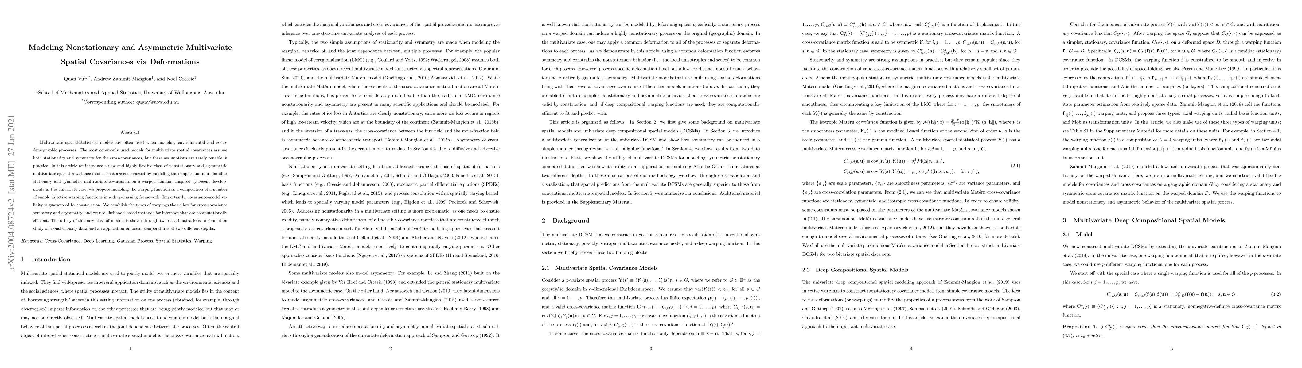 This paper introduces a flexible class of nonstationary and asymmetric multivariate spatial covariance models constructed via deformations of a warped domain. The proposed models, built using deep learning, allow for practical flexibility by abandoning stationarity and symmetry assumptions, ensuring covariance-model validity through construction and employing computationally efficient likelihood-based inference methods.