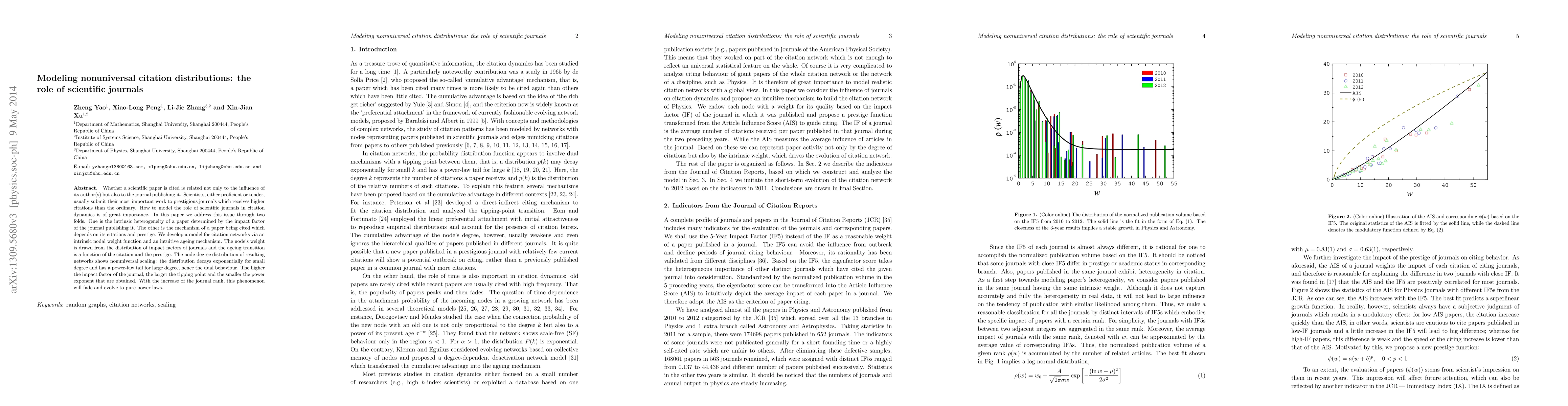 The paper introduces a novel citation network model incorporating journal impact factors and prestige, demonstrating nonuniversal scaling in node-degree distributions.