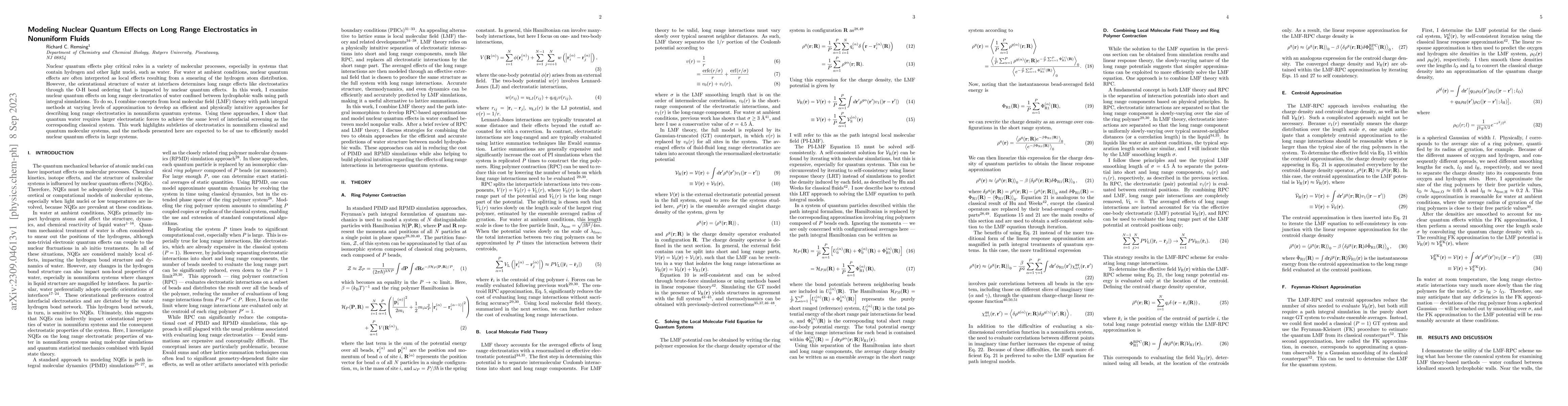 Nuclear quantum effects play critical roles in a variety of molecular processes, especially in systems that contain hydrogen and other light nuclei, such as water. For water at ambient conditions, nuclear quantum effects are often interpreted as local effects resulting from a smearing of the hydrogen atom distribution. However, the orientational structure of water at interfaces determines long range effects like electrostatics through the O-H bond ordering that is impacted by nuclear quantum effects. In this work, I examine nuclear quantum effects on long range electrostatics of water confined between hydrophobic walls using path integral simulations. To do so, I combine concepts from local molecular field (LMF) theory with path integral methods at varying levels of approximation to develop an efficient and physically intuitive approaches for describing long range electrostatics in nonuniform quantum systems. Using these approaches, I show that quantum water requires larger electrostatic forces to achieve the same level of interfacial screening as the corresponding classical system. This work highlights subtleties of electrostatics in nonuniform classical and quantum molecular systems, and the methods presented here are expected to be of use to efficiently model nuclear quantum effects in large systems.