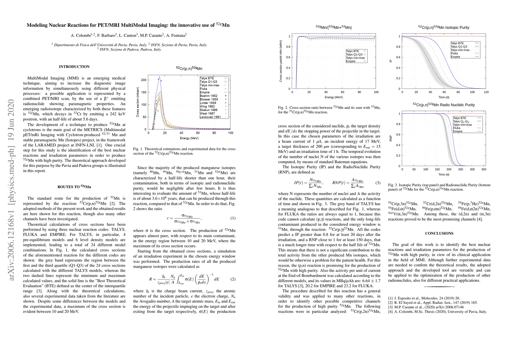 MultiModal Imaging is an innovative technique that consists in the combination of diagnostic exams based on different physical processes, to obtain a unique image with more detailed clinical information. The possibility of a simultaneous use of PET and MRI could be achieved by using a particular radioisotope: 52gMn. The main route to produce this isotope is the reaction 52Cr(p,n)52gMn which is theoretically investigated in this study by means of three nuclear reaction codes. An analysis of the cross sections and a computation of the production rates and time evolution of the produced radioisotopes are performed, to identify the optimal production parameters. The procedure described for this reaction has a general validity and is applied also to other reactions, such as 52Cr(d,2n)52gMn and natV(alpha,x)52gMn.
