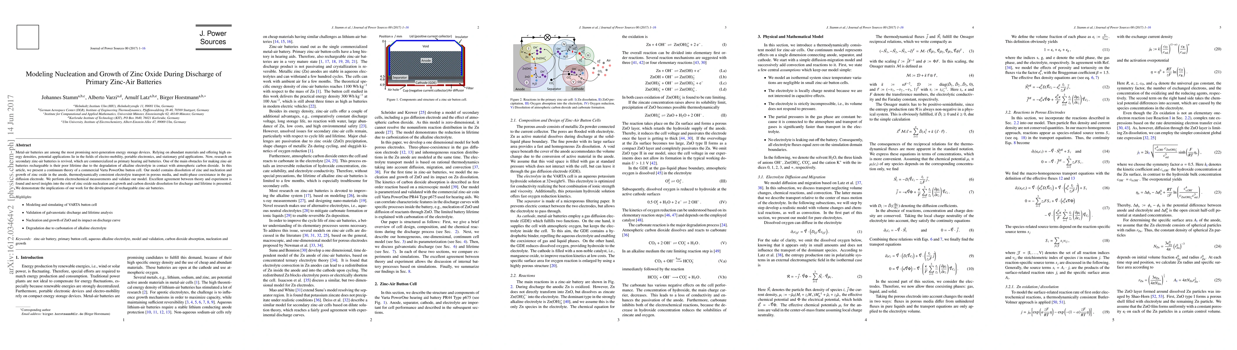 Metal-air batteries are among the most promising next-generation energy storage devices. Relying on abundant materials and offering high energy densities, potential applications lie in the fields of electro-mobility, portable electronics, and stationary grid applications. Now, research on secondary zinc-air batteries is revived, which are commercialized as primary hearing aid batteries. One of the main obstacles for making zinc-air batteries rechargeable is their poor lifetime due to the degradation of alkaline electrolyte in contact with atmospheric carbon dioxide. In this article, we present a continuum theory of a commercial Varta PowerOne button cell. Our model contains dissolution of zinc and nucleation and growth of zinc oxide in the anode, thermodynamically consistent electrolyte transport in porous media, and multi-phase coexistance in the gas diffusion electrode. We perform electrochemical measurements and validate our model. Excellent agreement between theory and experiment is found and novel insights into the role of zinc oxide nucleation and growth and carbon dioxide dissolution for discharge and lifetime is presented. We demonstrate the implications of our work for the development of rechargeable zinc-air batteries.