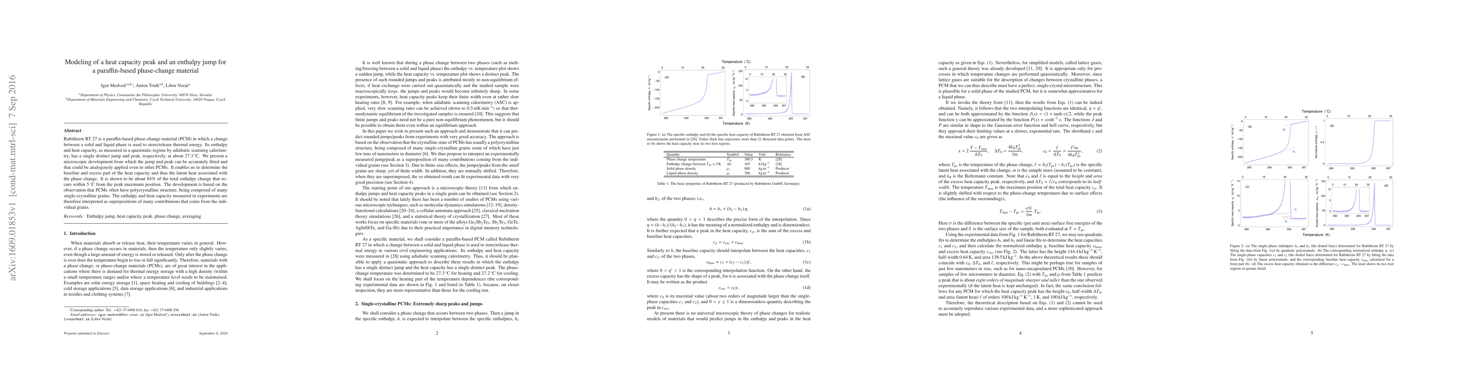 Researchers developed a model to accurately fit the heat capacity peak and enthalpy jump in Rubitherm RT 27, a paraffin-based phase-change material, revealing that the heat capacity is about 84% of the total enthalpy change within 5 degrees from the peak maximum position.