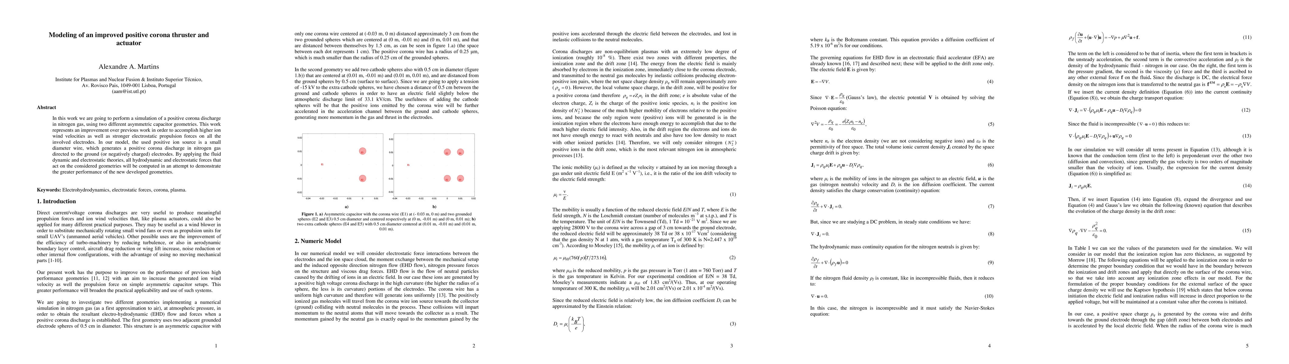 In this work we are going to perform a simulation of a positive corona discharge in nitrogen gas, using two different asymmetric capacitor geometries. This work represents an improvement over previous work in order to accomplish higher ion wind velocities as well as stronger electrostatic propulsion forces on all the involved electrodes. In our model, the used positive ion source is a small diameter wire, which generates a positive corona discharge in nitrogen gas directed to the ground (or negatively charged) electrodes. By applying the fluid dynamic and electrostatic theories, all hydrodynamic and electrostatic forces that act on the considered geometries will be computed in an attempt to demonstrate the greater performance of the new developed geometries.