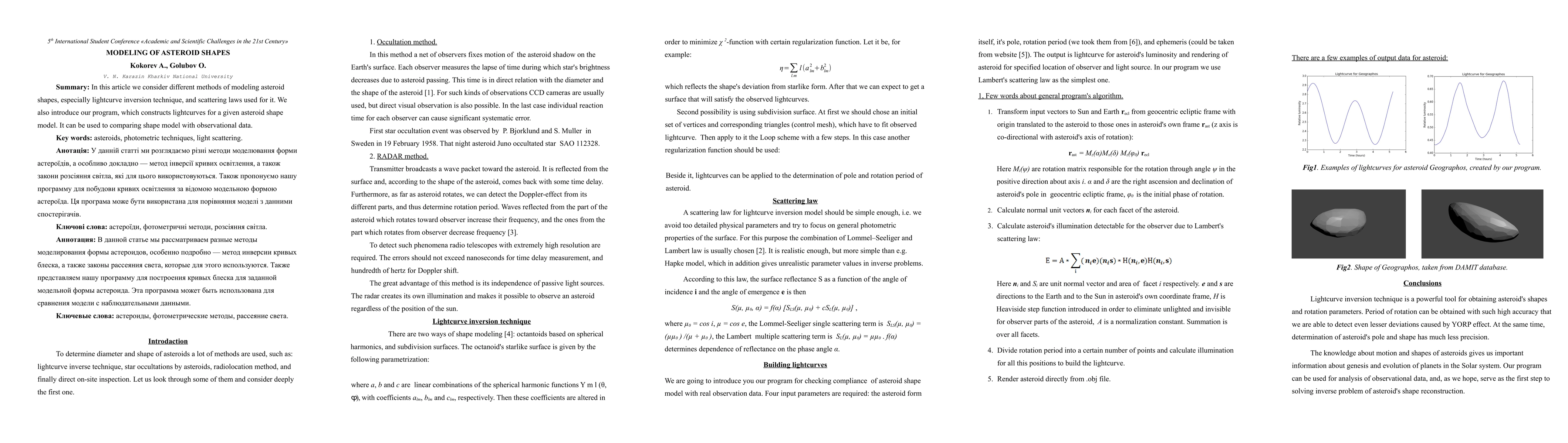 This paper explores various methods for modeling asteroid shapes, focusing on the lightcurve inversion technique and scattering laws. It introduces a new program that generates lightcurves for given asteroid shape models, facilitating comparisons with observational data.