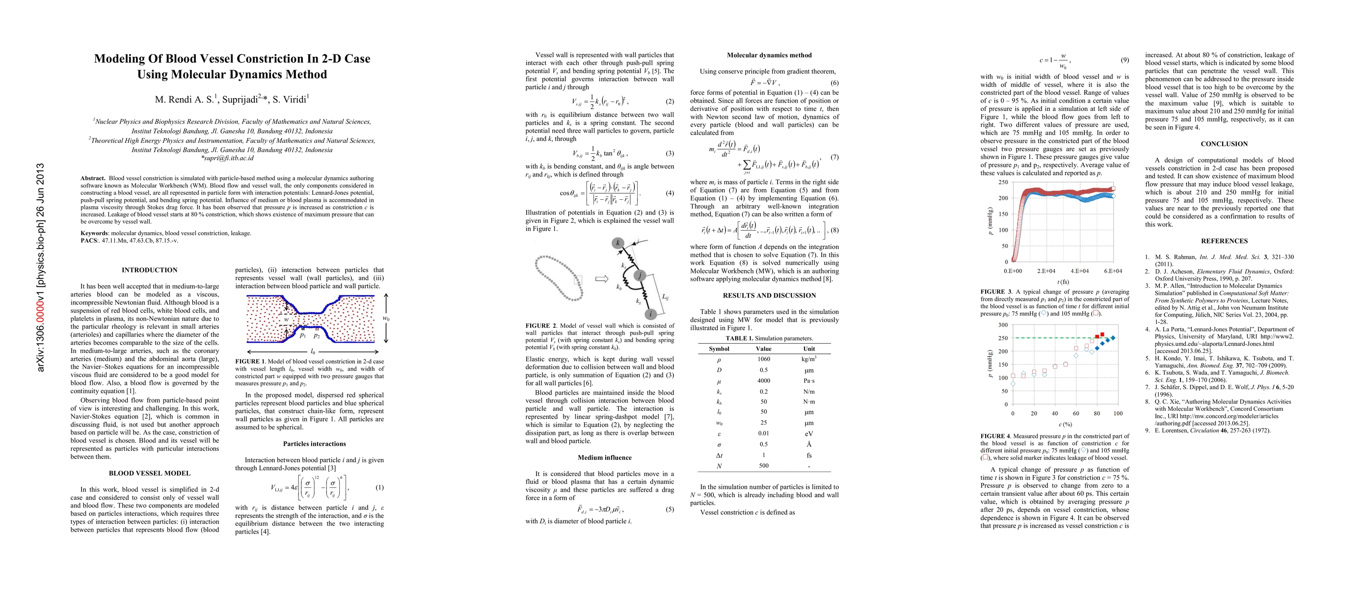Researchers used molecular dynamics to simulate blood vessel constriction, finding that pressure increases with constriction levels and leakage occurs at 80% constriction, revealing a maximum pressure threshold for the vessel wall.