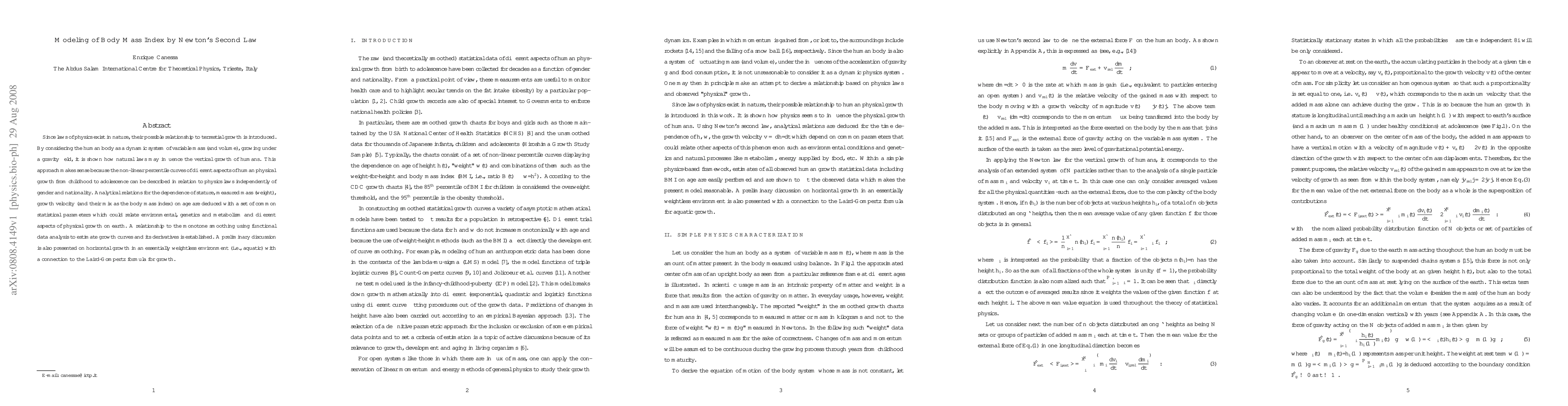 Since laws of physics exist in nature, their possible relationship to terrestial growth is introduced. By considering the human body as a dynamic system of variable mass (and volume), growing under a gravity field, it is shown how natural laws may influence the vertical growth of humans. This approach makes sense because the non-linear percentile curves of different aspects of human physical growth from childhood to adolescence can be described in relation to physics laws independently of gender and nationality. Analytical relations for the dependence of stature, measured mass (weight), growth velocity (and their mix as the body mass index) on age are deduced with a set of common statistical parameters which could relate environmental, genetics and metabolism and different aspects of physical growth on earth. A relationship to the monotone smoothing using functional data analysis to estimate growth curves and its derivatives is established. A preliminary discussion is also presented on horizontal growth in an essentially weightless environment (i.e., aquatic) with a connection to the Laird-Gompertz formula for growth.