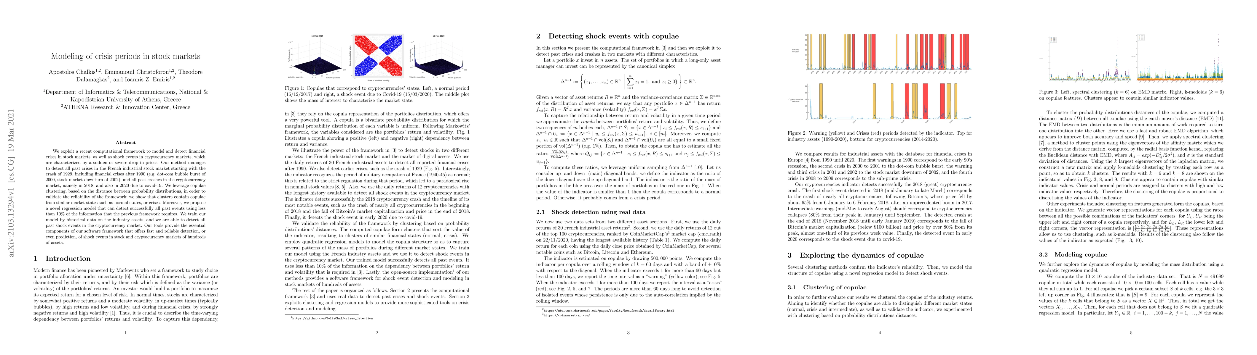 This paper introduces a computational framework for detecting financial crises and shock events in stock and cryptocurrency markets using copulae clustering and a novel regression model. The framework successfully identifies past crises and crashes, requiring significantly less data than previous methods.