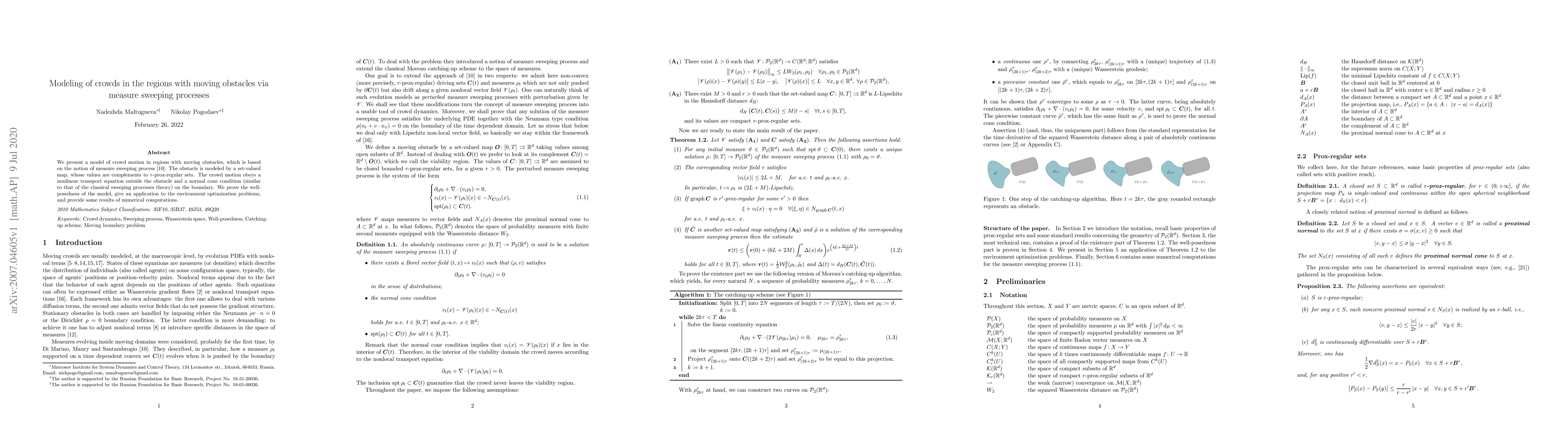 This paper models crowd motion in regions with moving obstacles using measure sweeping processes, proving well-posedness and applying the model to optimize environments. Numerical computations demonstrate the model's effectiveness.