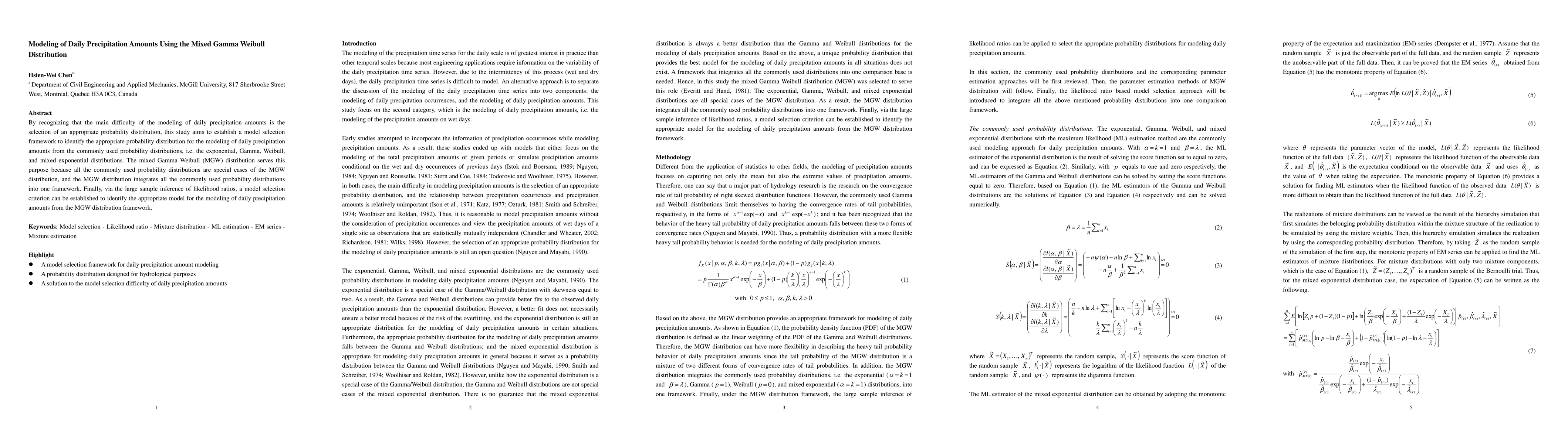 By recognizing that the main difficulty of the modeling of daily precipitation amounts is the selection of an appropriate probability distribution, this study aims to establish a model selection framework to identify the appropriate probability distribution for the modeling of daily precipitation amounts from the commonly used probability distributions, i.e. the exponential, Gamma, Weibull, and mixed exponential distributions. The mixed Gamma Weibull (MGW) distribution serves this purpose because all the commonly used probability distributions are special cases of the MGW distribution, and the MGW distribution integrates all the commonly used probability distributions into one framework. Finally, via the large sample inference of likelihood ratios, a model selection criterion can be established to identify the appropriate model for the modeling of daily precipitation amounts from the MGW distribution framework.