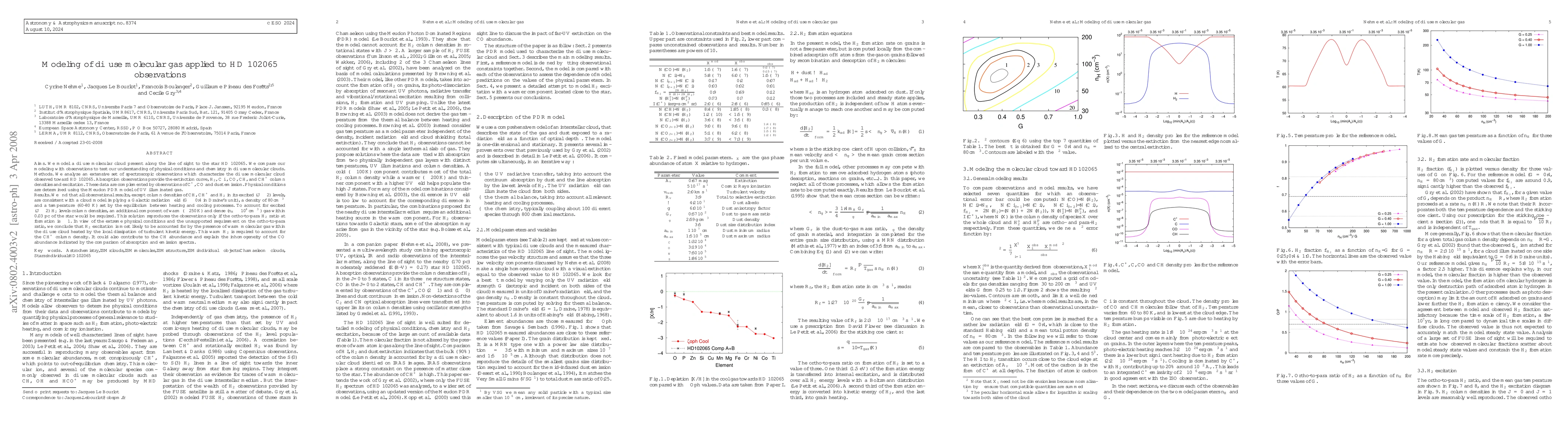Aims. We model a diffuse molecular cloud present along the line of sight to the star HD 102065. We compare our modeling with observations to test our understanding of physical conditions and chemistry in diffuse molecular clouds. Methods. We analyze an extensive set of spectroscopic observations which characterize the diffuse molecular cloud observed toward HD 102065. Absorption observations provide the extinction curve, H2, C I, CO, CH, and CH+ column densities and excitation. These data are complemented by observations of CII, CO and dust emission. Physical conditions are determined using the Meudon PDR model of UV illuminated gas. Results. We find that all observational results, except column densities of CH, CH+ and H2 in its excited (J > 2) levels, are consistent with a cloud model implying a Galactic radiation field (G~0.4 in Draine's unit), a density of 80 cm-3 and a temperature (60-80 K) set by the equilibrium between heating and cooling processes. To account for excited (J >2) H2 levels column densities, an additional component of warm (~ 250K) and dense (nH>10^4 cm-3) gas within 0.03 pc of the star would be required. This solution reproduces the observations only if the ortho-to-para H2 ratio at formation is 1. In view of the extreme physical conditions and the unsupported requirement on the ortho-to-para ratio, we conclude that H2 excitation is most likely to be accounted for by the presence of warm molecular gas within the diffuse cloud heated by the local dissipation of turbulent kinetic energy. This warm H2 is required to account for the CH+ column density. It could also contribute to the CH abundance and explain the inhomogeneity of the CO abundance indicated by the comparison of absorption and emission spectra.