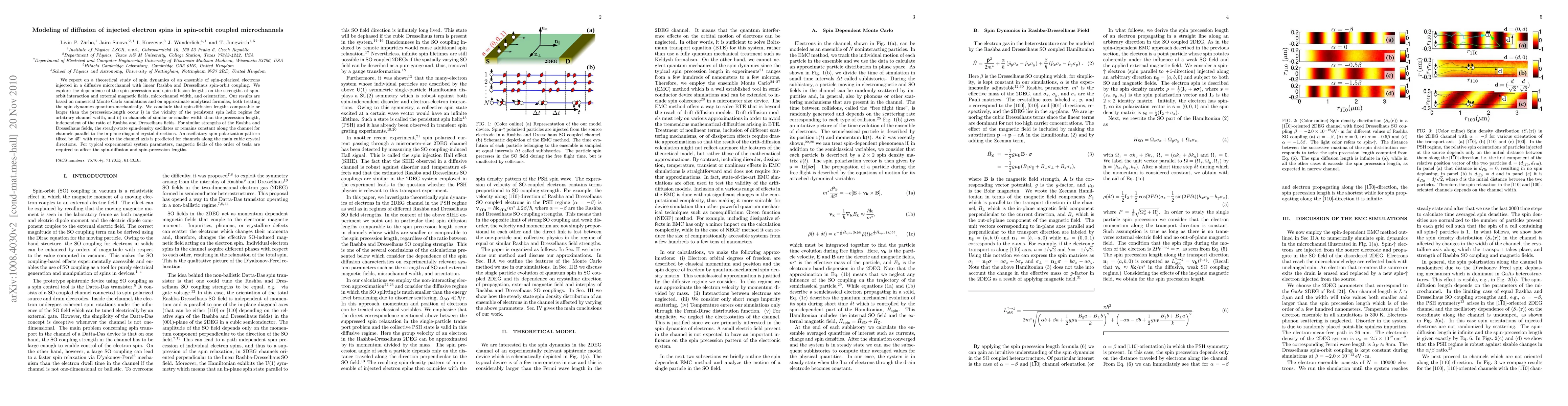 This paper explores the spin dynamics of spin-polarized electrons in spin-orbit coupled microchannels using Monte Carlo simulations and analytical methods. It finds that spin-diffusion lengths can be comparable to precession lengths under specific conditions, such as near the persistent spin helix regime or in narrow channels.
