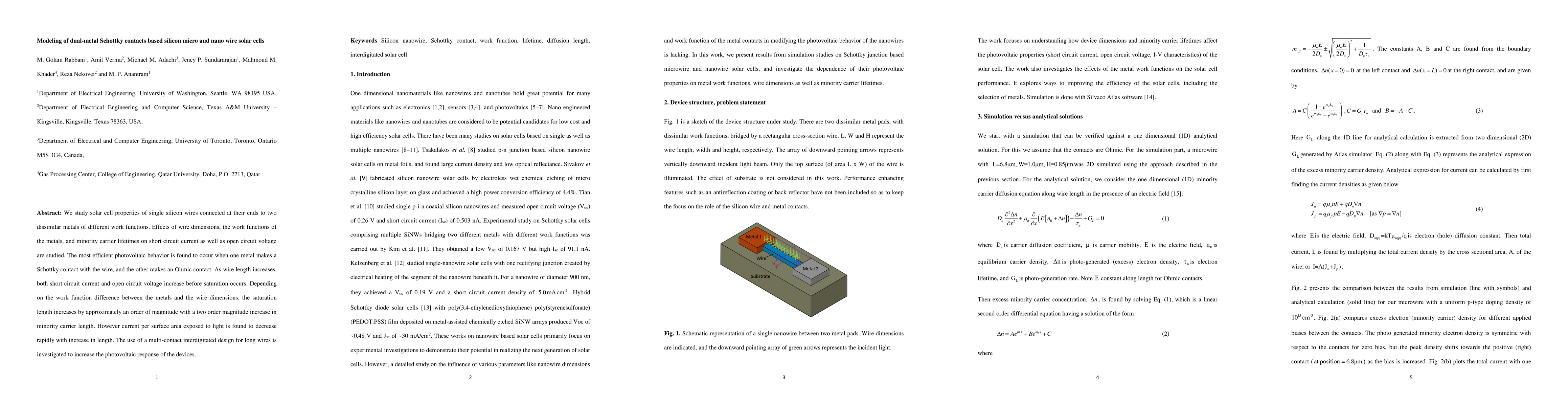 We study solar cell properties of single silicon wires connected at their ends to two dissimilar metals of different work functions. Effects of wire dimensions, the work functions of the metals, and minority carrier lifetimes on short circuit current as well as open circuit voltage are studied. The most efficient photovoltaic behavior is found to occur when one metal makes a Schottky contact with the wire, and the other makes an Ohmic contact. As wire length increases, both short circuit current and open circuit voltage increase before saturation occurs. Depending on the work function difference between the metals and the wire dimensions, the saturation length increases by approximately an order of magnitude with a two order magnitude increase in minority carrier length. However current per surface area exposed to light is found to decrease rapidly with increase in length. The use of a multi-contact interdigitated design for long wires is investigated to increase the photovoltaic response of the devices.