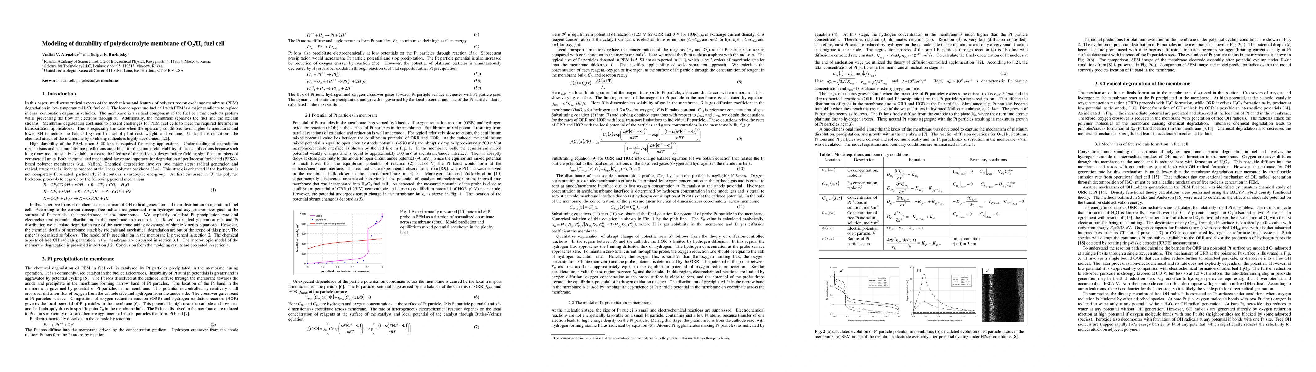 In this paper, we discuss critical aspects of the mechanisms and features of polymer proton exchange membrane (PEM) degradation in low-temperature H2/O2 fuel cell. In this paper, we focused on chemical mechanism of OH radical generation and their distribution in operational fuel cell. According to the current concept, free radicals are generated from hydrogen and oxygen crossover gases at the surface of Pt particles that precipitated in the membrane. We explicitly calculate Pt precipitation rate and electrochemical potential distribution in the membrane that controls it. Based on radical generation rate and Pt distribution we calculate degradation rate of the membrane taking advantage of simple kinetics equations.