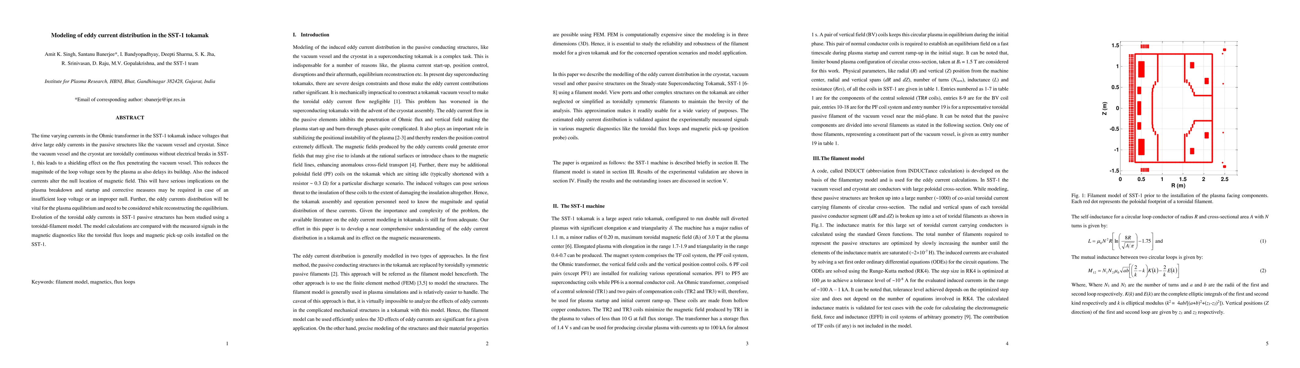 This paper models the eddy current distribution in the SST-1 tokamak, focusing on the induced currents in passive structures like the vacuum vessel and cryostat. The study finds that these currents affect plasma equilibrium and may require corrective measures for proper startup and operation.