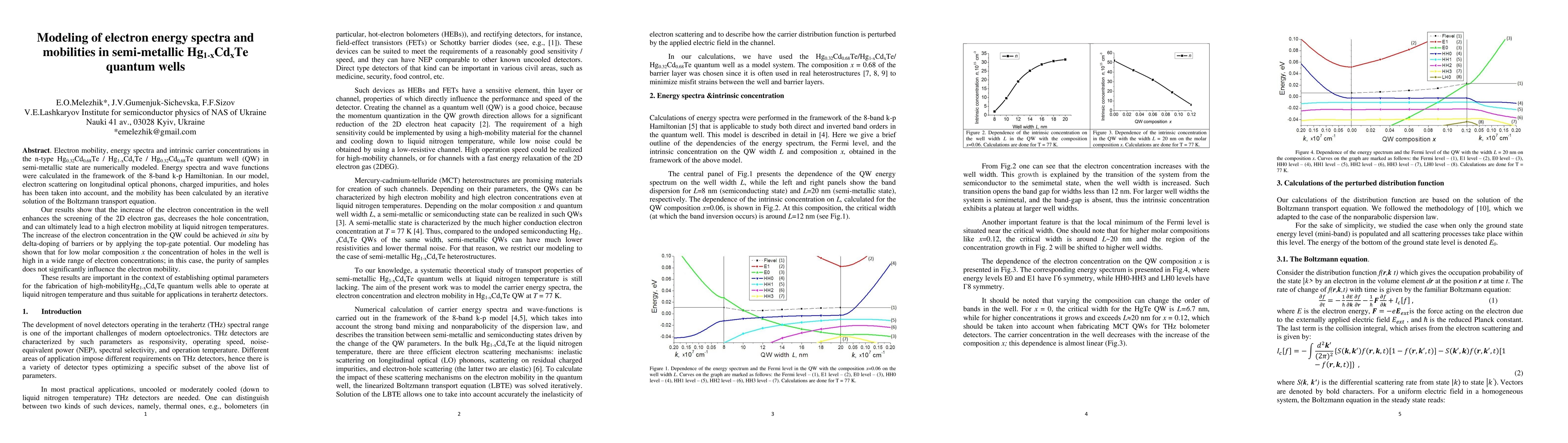 Electron mobility, energy spectra and intrinsic carrier concentrations in the n-type Hg0.32Cd0.68Te / Hg1-xCdxTe / Hg0.32Cd0.68Te quantum well (QW) in semi-metallic state are numerically modeled. Energy spectra and wave functions were calculated in the framework of the 8-band k-p Hamiltonian. In our model, electron scattering on longitudinal optical phonons, charged impurities, and holes has been taken into account, and the mobility has been calculated by an iterative solution of the Boltzmann transport equation. Our results show that the increase of the electron concentration in the well enhances the screening of the 2D electron gas, decreases the hole concentration, and can ultimately lead to a high electron mobility at liquid nitrogen temperatures. The increase of the electron concentration in the QW could be achieved in situ by delta-doping of barriers or by applying the top-gate potential. Our modeling has shown that for low molar composition x the concentration of holes in the well is high in a wide range of electron concentrations; in this case, the purity of samples does not significantly influence the electron mobility. These results are important in the context of establishing optimal parameters for the fabrication of high-mobility Hg1-xCdxTe quantum wells able to operate at liquid nitrogen temperature and thus suitable for applications in terahertz detectors.